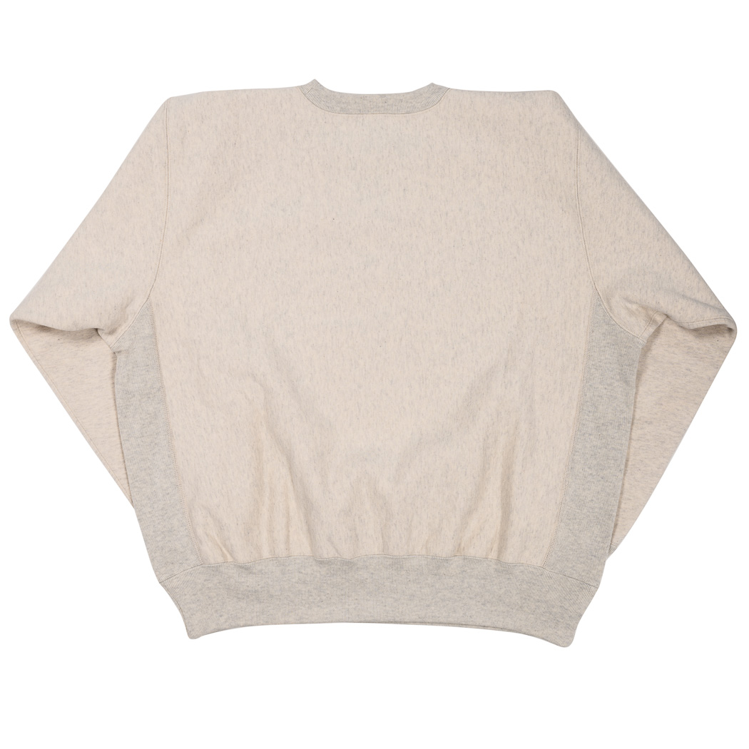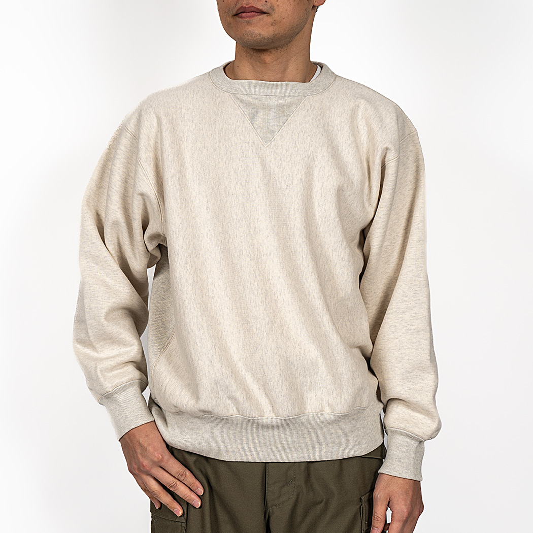 18ゲージでガチガチに目を詰めて編んでいるので形崩れしにくい。重さ15 オンス程あり、いわゆる「超ヘビーウェイトスウェット」。でも化繊は使っていないのでしなやか。