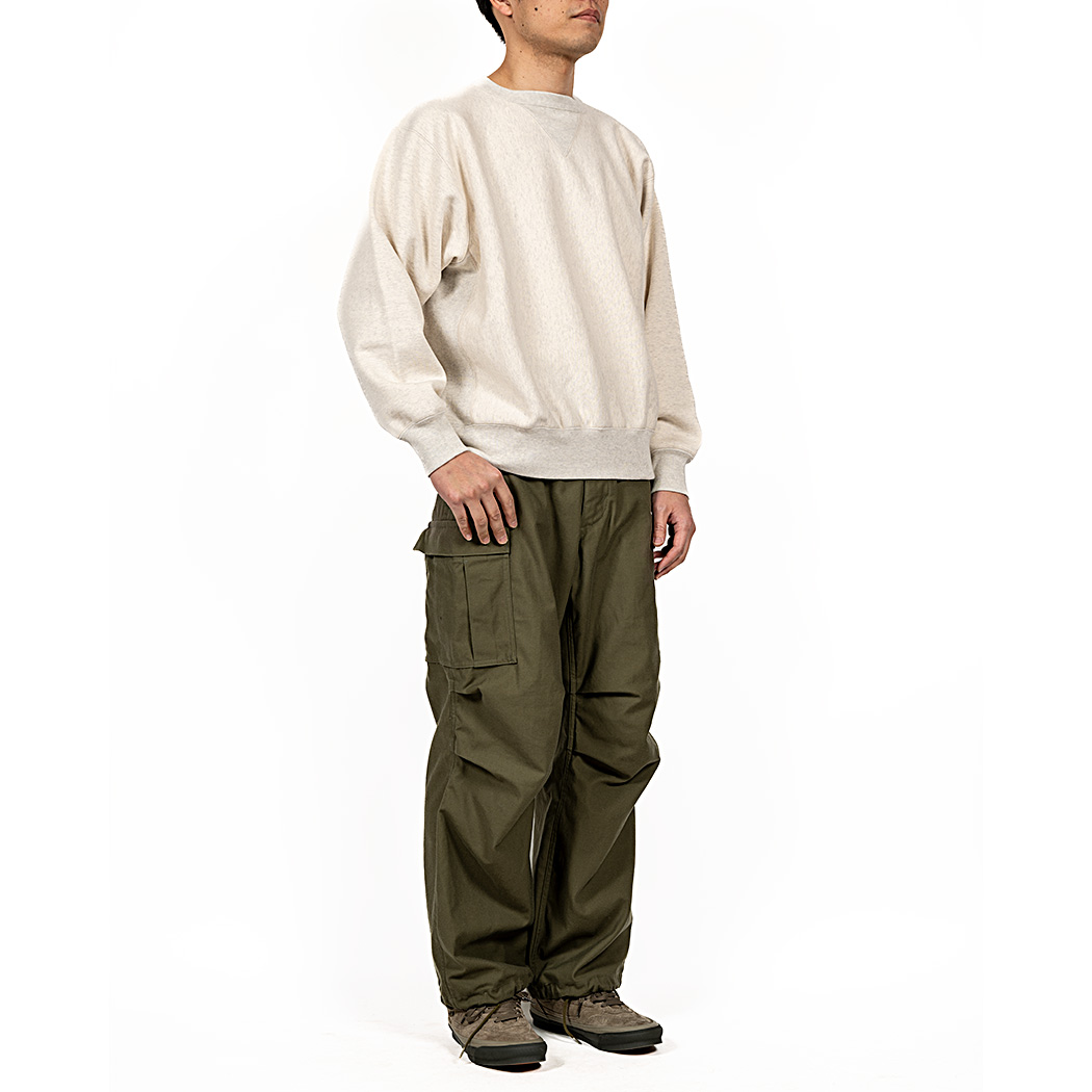 本家は化繊入り・カサッとしたスウェット生地に対し、WORKERS は表30番・中30番・裏7番の綿100。裏の糸ループを短く編み、 さらに起毛をかけた本格的冬用スウェットです。