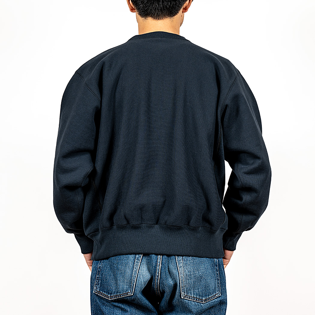 18ゲージでガチガチに目を詰めて編んでいるので形崩れしにくい。重さ15 オンス程あり、いわゆる「超ヘビーウェイトスウェット」。でも化繊は使っていないのでしなやか。