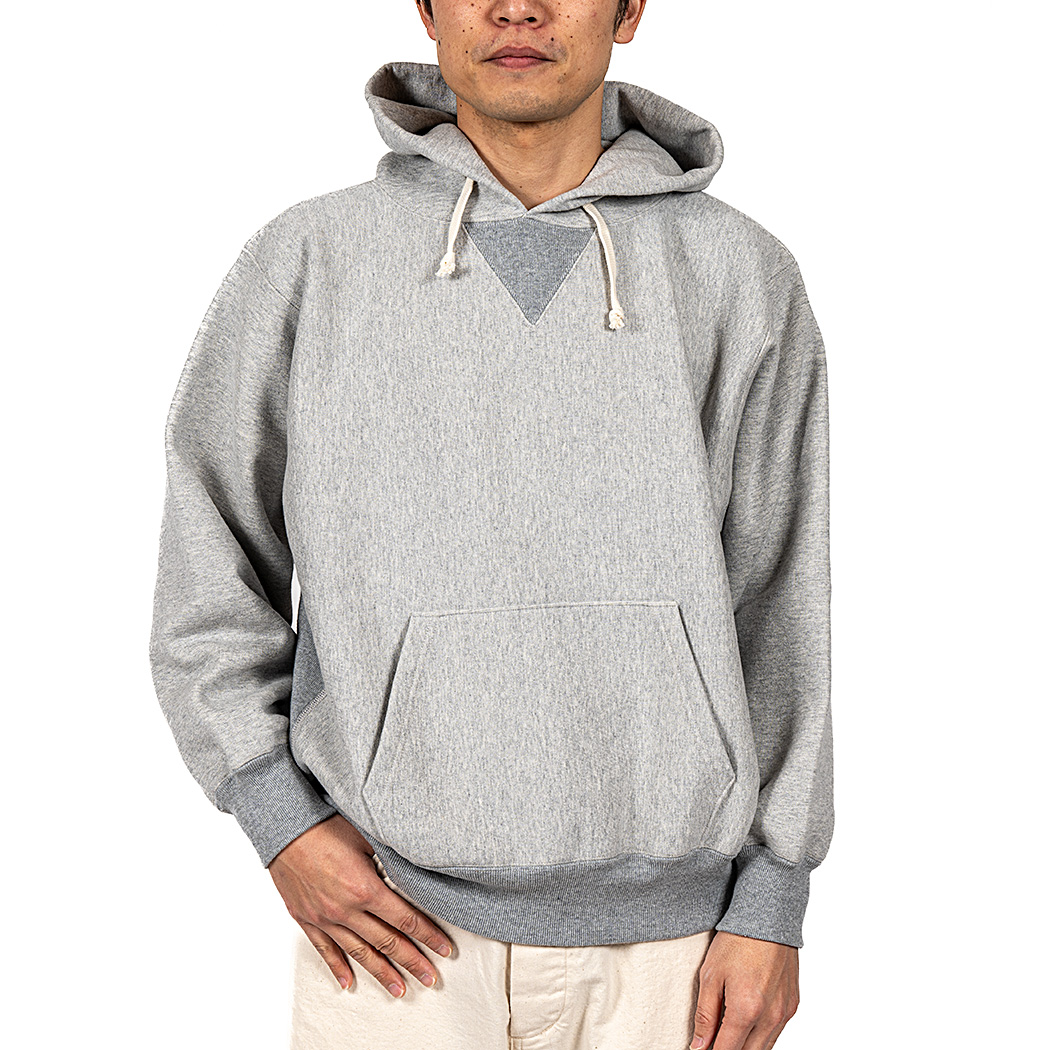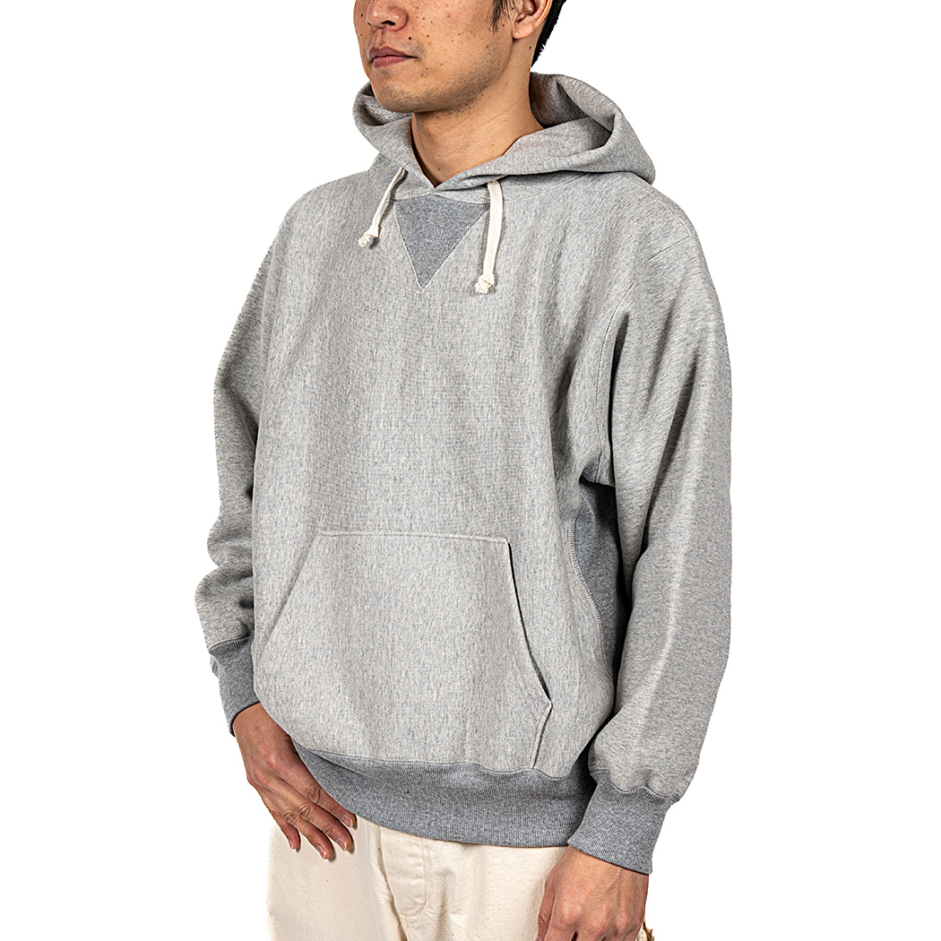 身頃はヨコ取りしたトリコタグのクルー/ パーカーが元ネタ。いわゆるリバースタイプ。