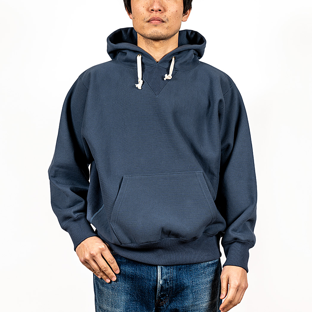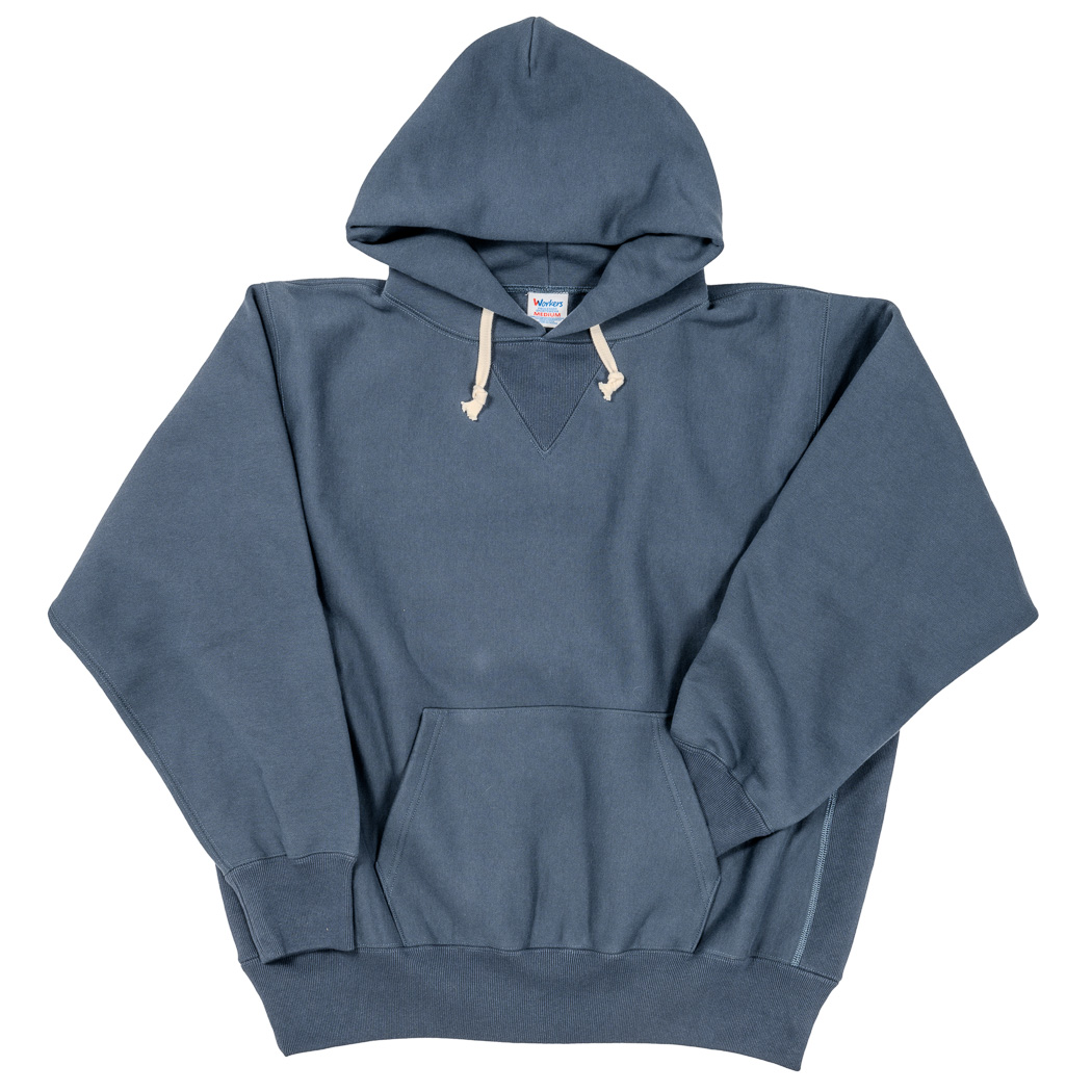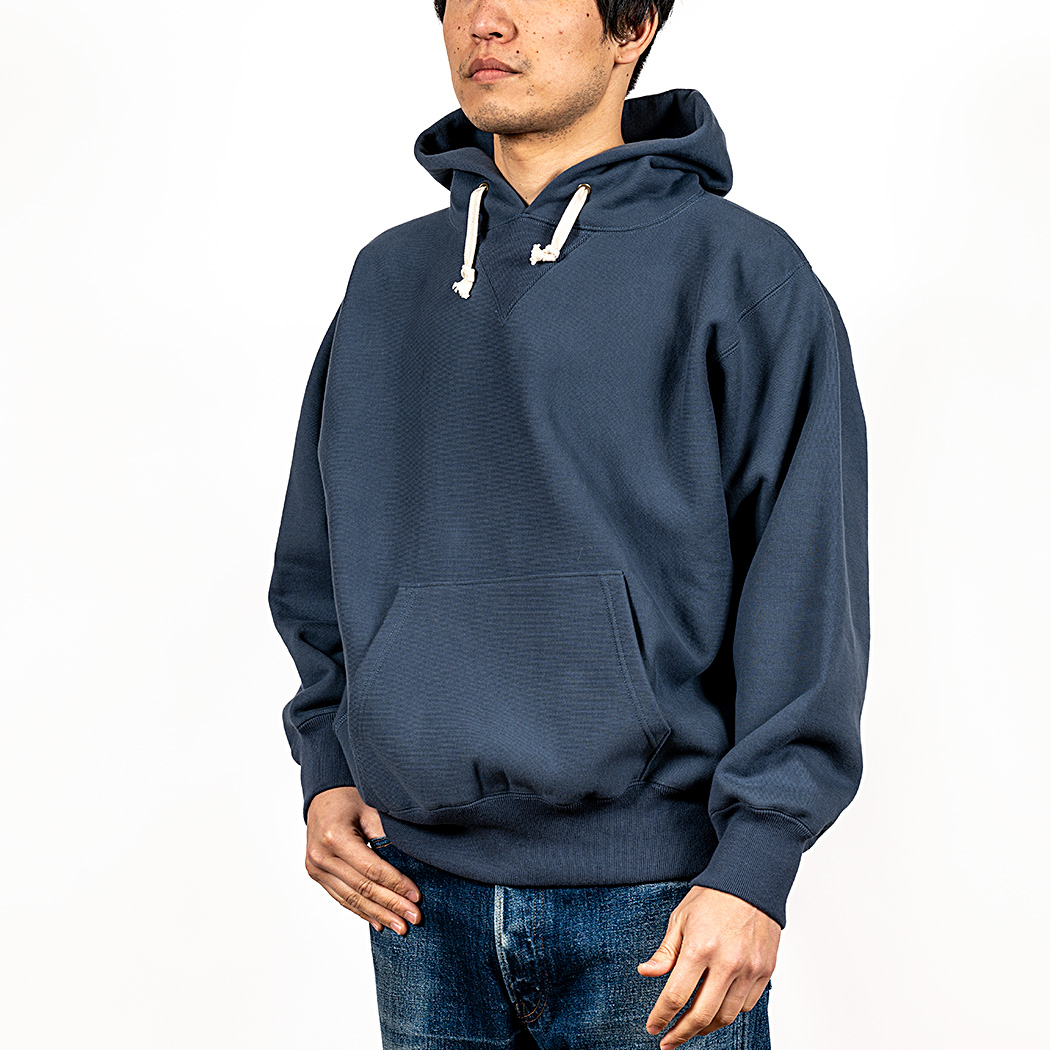 本家は化繊入り・カサッとしたスウェット生地に対し、WORKERS は表30番・中30番・裏7番の綿100。裏の糸ループを短く編み、 さらに起毛をかけた本格的冬用スウェットです。