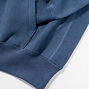 18ゲージでガチガチに目を詰めて編んでいるので形崩れしにくい。重さ15 オンス程あり、いわゆる「超ヘビーウェイトスウェット」。でも化繊は使っていないのでしなやか。