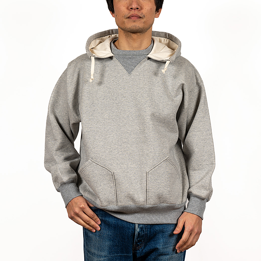 ビンテージを色々見ていたら発見した仕様。おそらく、フード裏までボディと同じ裏毛だと厚みがありすぎて洗濯したと き本当に乾きが悪い。そのあたりを解消するためにフード裏だけは別生地にしたのだと想像しています。