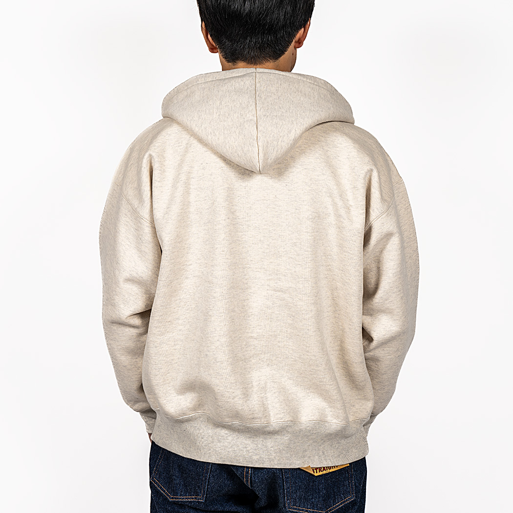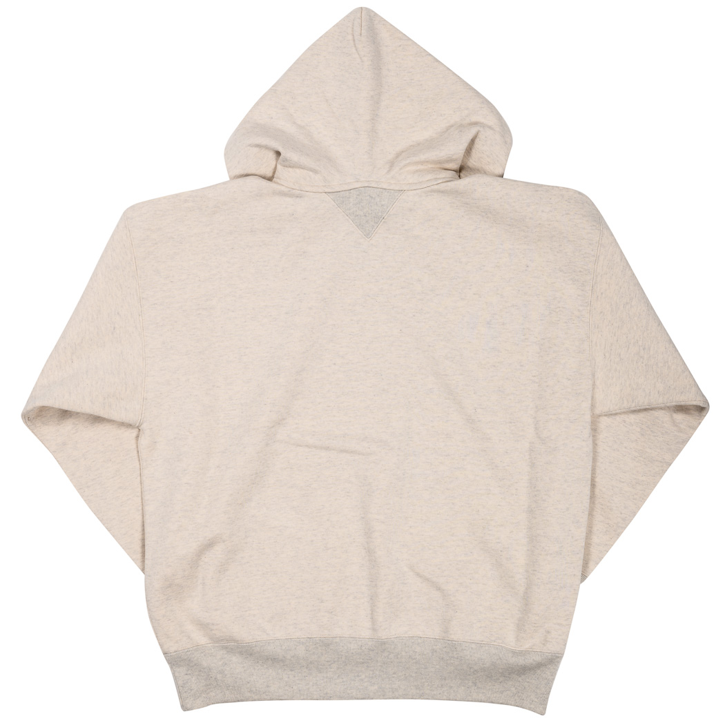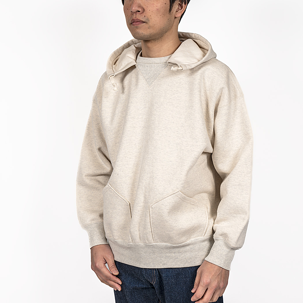 ビンテージを色々見ていたら発見した仕様。おそらく、フード裏までボディと同じ裏毛だと厚みがありすぎて洗濯したと き本当に乾きが悪い。そのあたりを解消するためにフード裏だけは別生地にしたのだと想像しています。