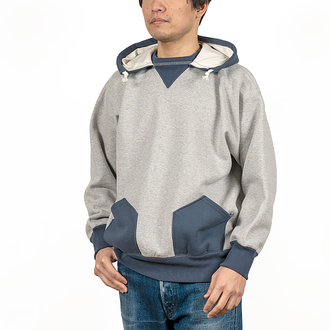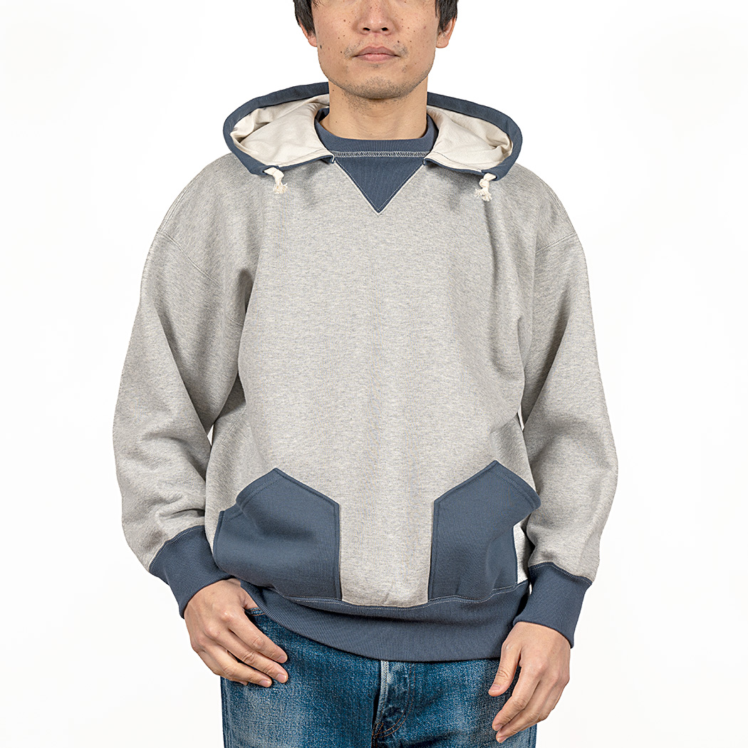 ビンテージを色々見ていたら発見した仕様。おそらく、フード裏までボディと同じ裏毛だと厚みがありすぎて洗濯したと き本当に乾きが悪い。そのあたりを解消するためにフード裏だけは別生地にしたのだと想像しています。