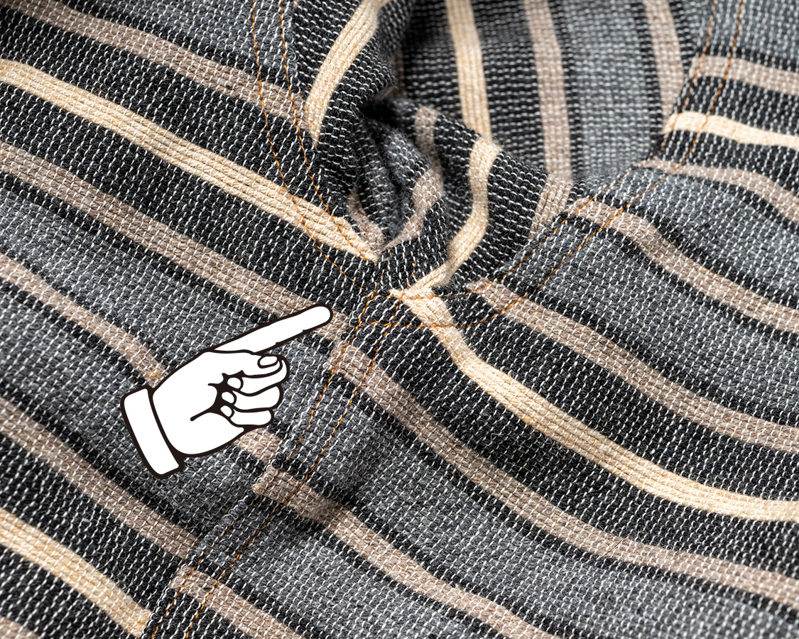 わきの下の段差。厚みが矢印で集中しないよう、あえて、前・後ろの身頃、袖に段差をつけています。