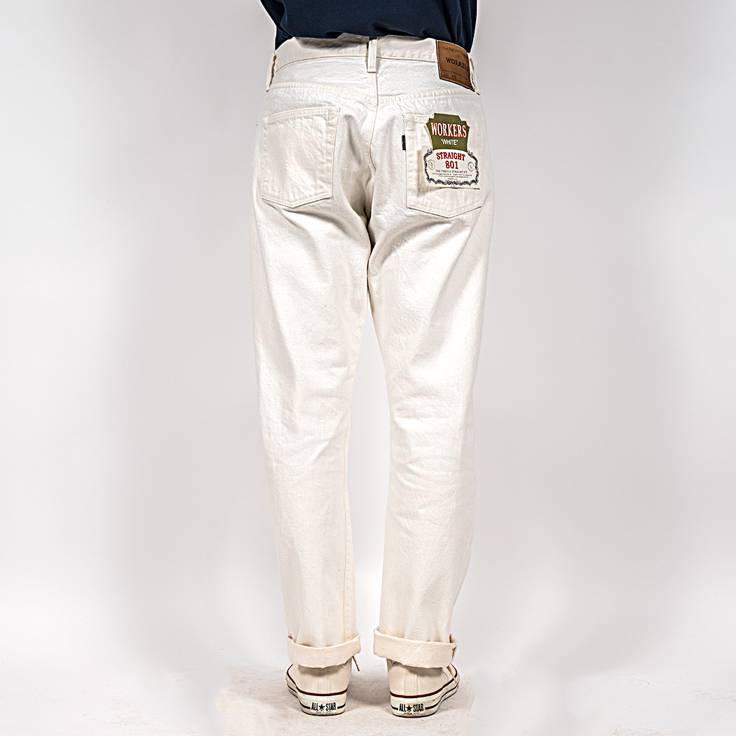 ホワイトデニムはインディゴやブラックに比べて固く感じます。サイズは、きつすぎないゆとりあるサイズを選んでください。