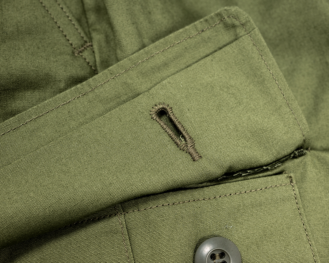 露出しないボタン。ジャングルファティーグ、最初は露出していましたが都合が悪かったのでしょう。セカンドモデルからヒヨクがつくようになります。