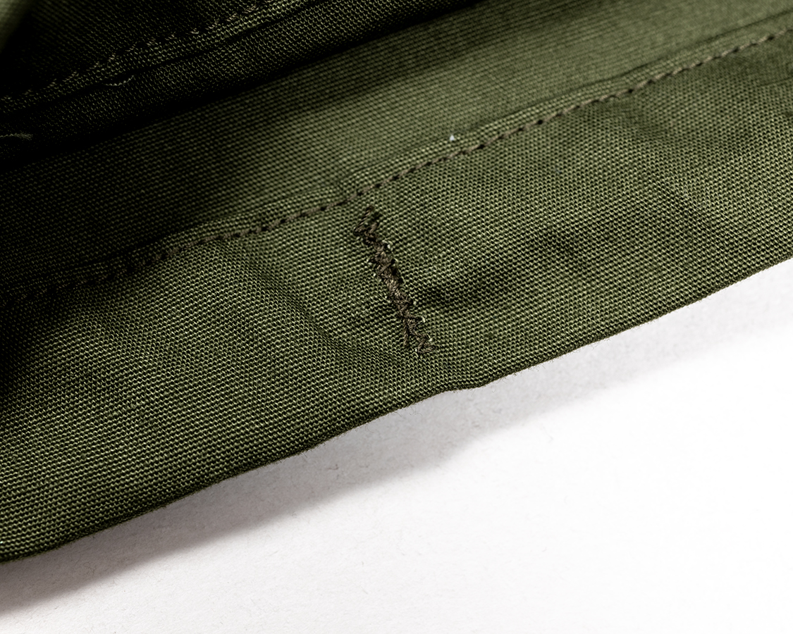 ボタンホールが開いた部分は補強布を中にかませています。一枚のところにホールを開けると強度的に厳しいので。