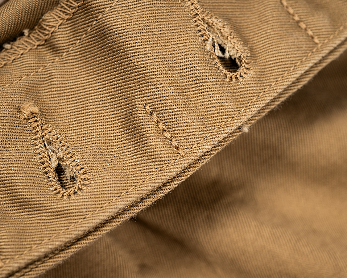 ヒヨク止めステッチ入り。これもクラシックなトラウザーズの仕様で、初めて古着のチノパンを見たとき「ステッチがあるのに、なんで表に見えないだ!!!!!」と頭が混乱したのが懐かしい。見返しだけに止めています。