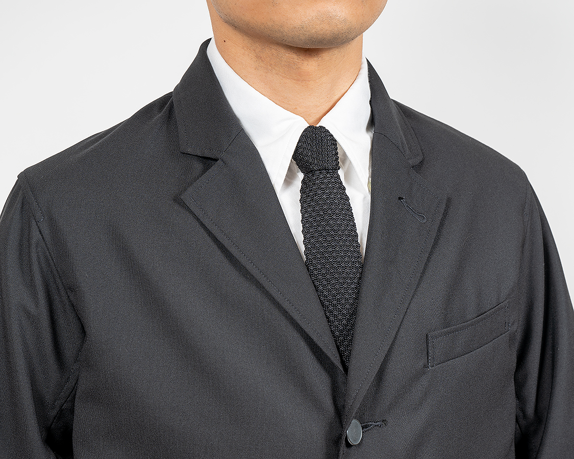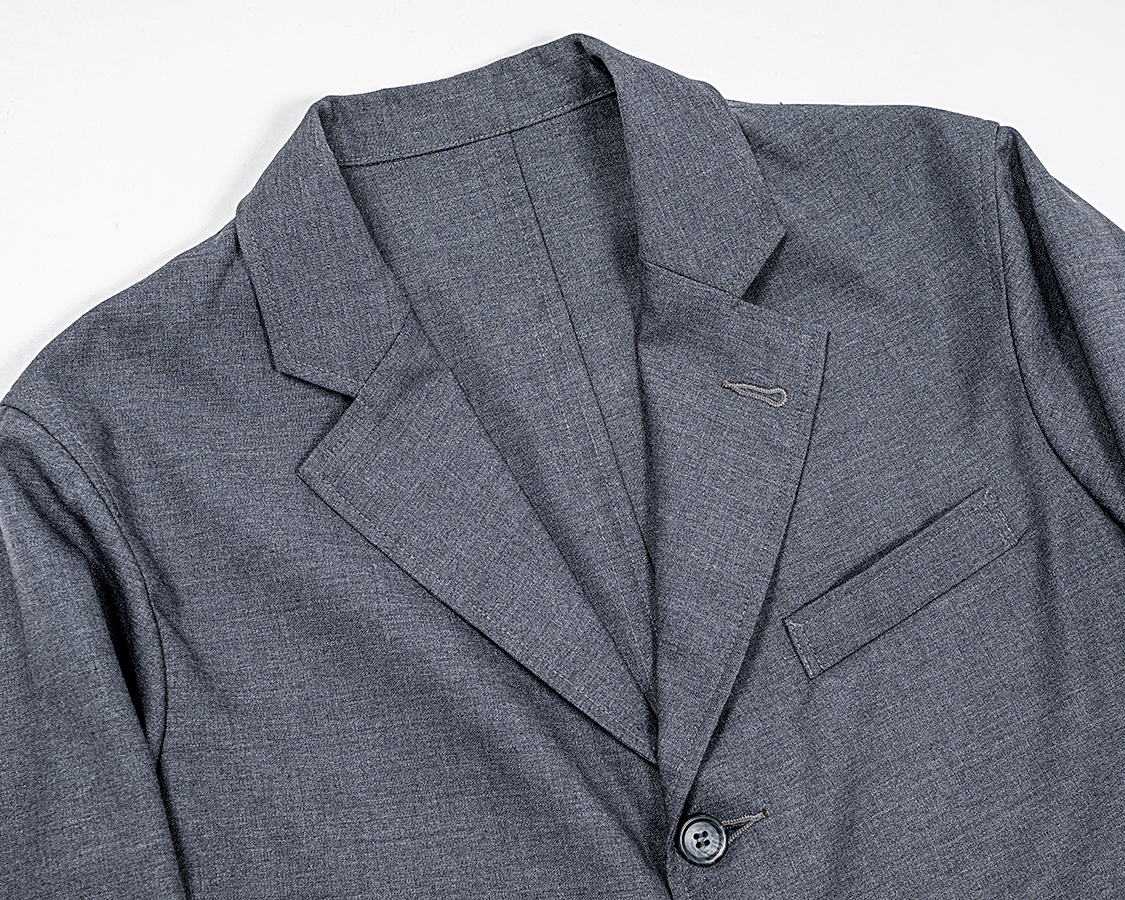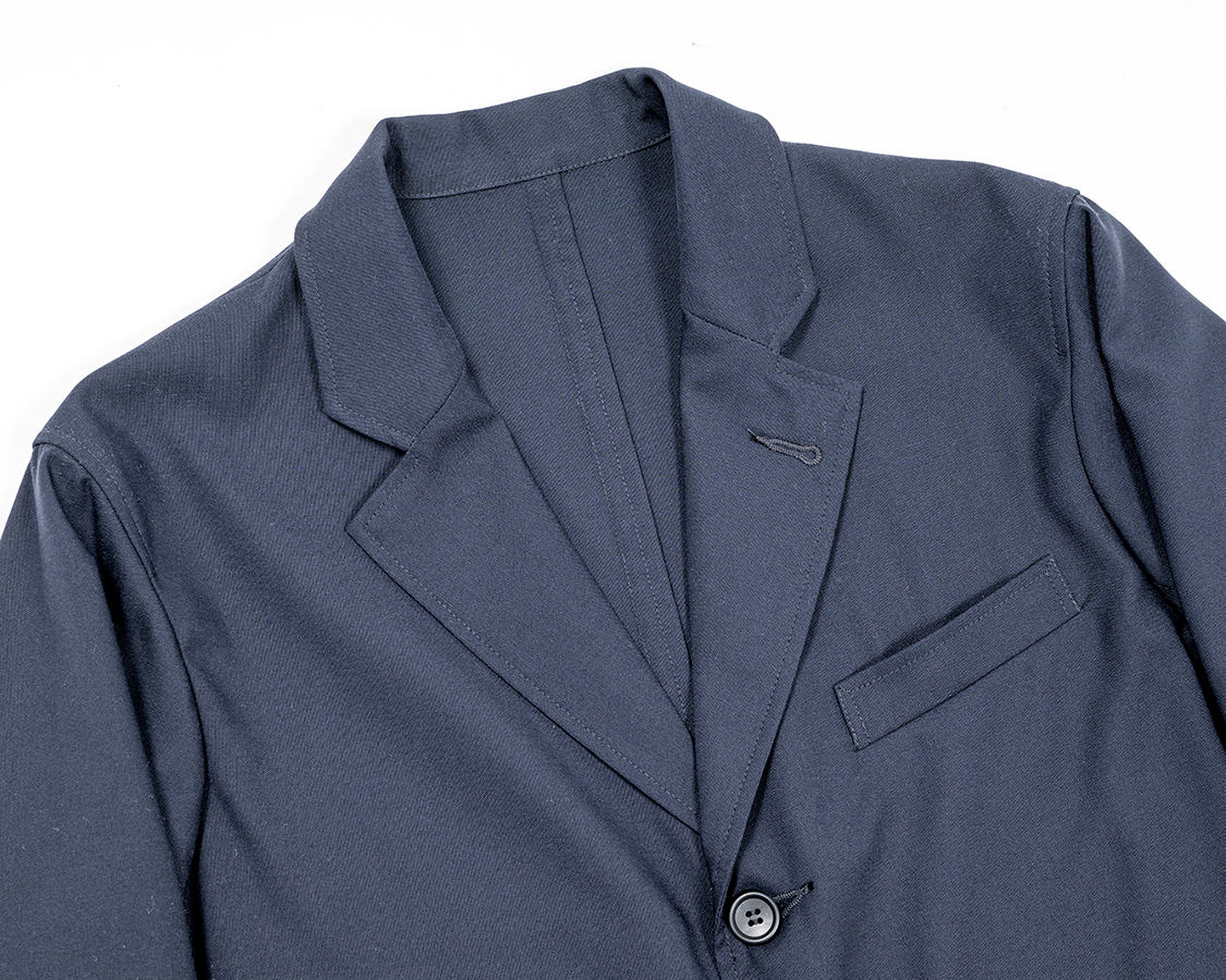 ネイビーは昨年から継続。皺になりづらい、強度がある、コーデュラナイロンを混紡したコンバットウールトロピカル。ボタンを昨年のメタルから練ボタンに変更。