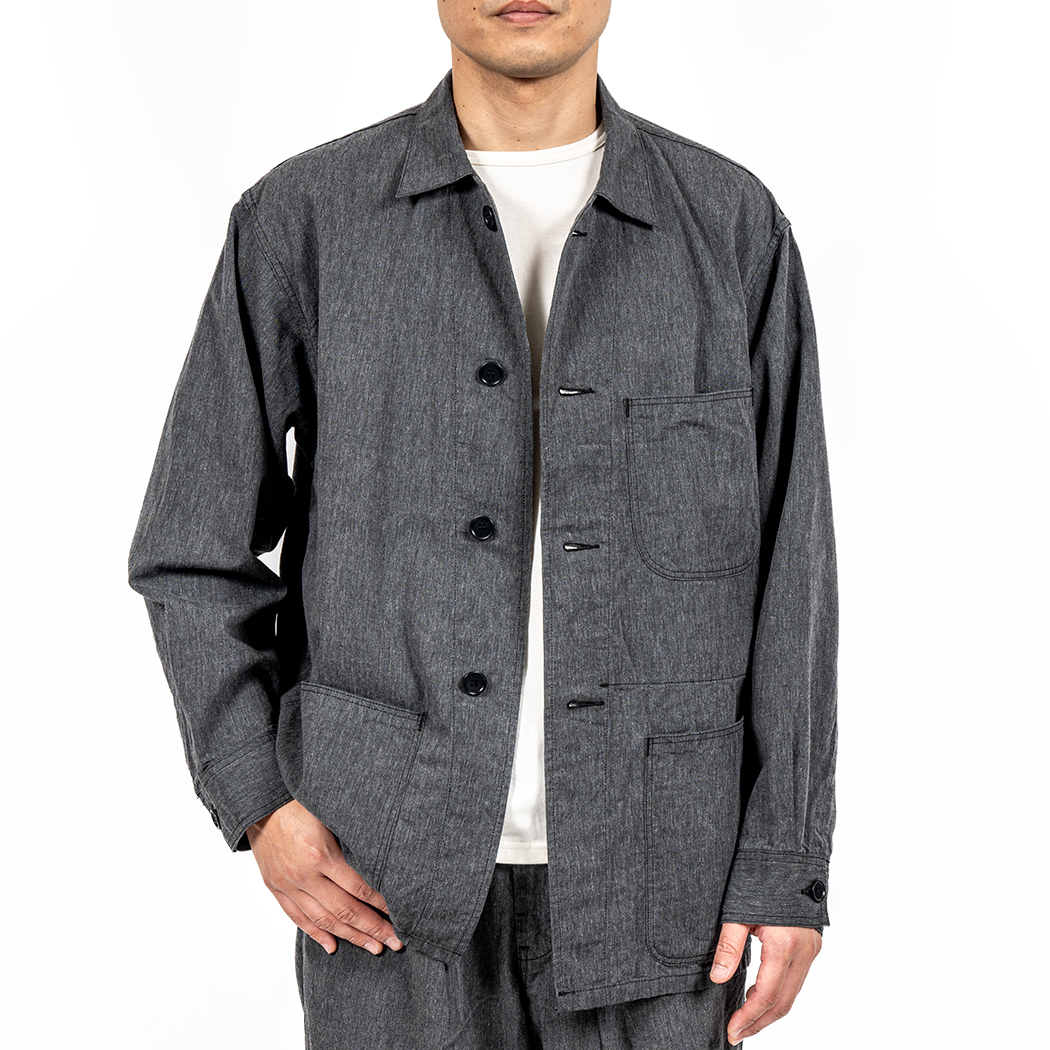 素材、ブラックシャンブレーが5オンス。今回のラインナップで一番薄い。いわゆる「シャツに使われるシャンブレー」の厚さ。真夏まで着られる。