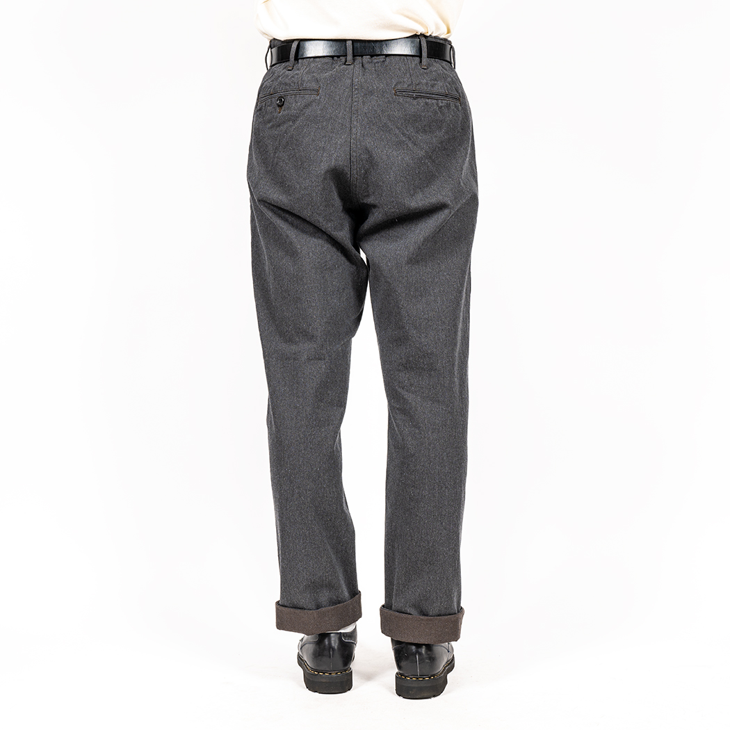 素材コットンサージはWORKERS オリジナル。タテ糸にワタで混ぜたグレー(トップ糸)、ヨコ糸に濃いブラウン。微妙にブラウンがかったグレーはめったに見かけない色合い。