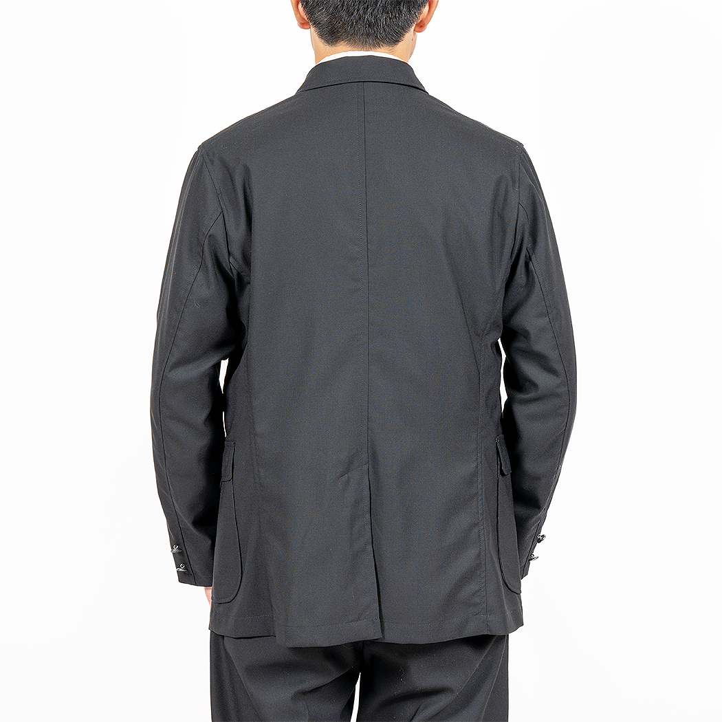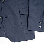 仕様は三つボタン、上二つがけ。胸箱ポケット。腰、パッチ&フラップ。センターベント。襟・ラペル1/4 インチ・ミシンステッチ。身頃裏無し、袖裏有り。