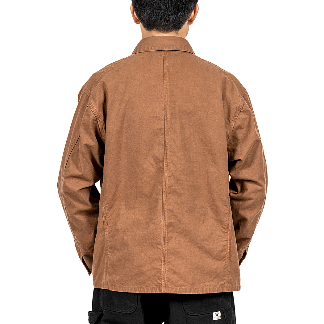 WOREKRS、以前は着丈72-3センチの長めのカバーオールを作ってました。参考にするオリジナルは長い!平気で75-80弱着丈があるので、さすがに長かろうと72-3センチで作っていました。が、それでも身長170前後の日本人が着ると長く見える。