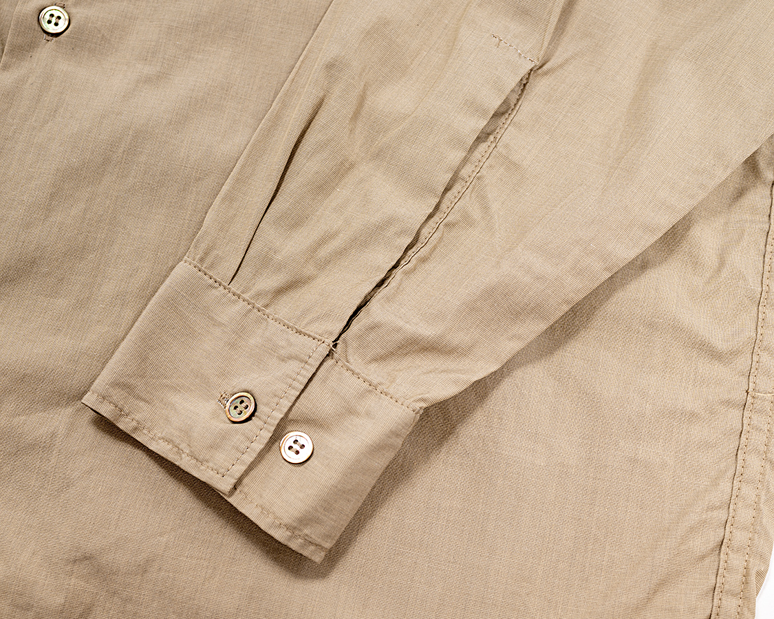 角型カフス+イッテコイ開き。袖に切込みを入れて、パイピング状に生地でくわえ込み縫い。このくわえ込み縫いするときに、切込みの奥まで「行って」「帰る」から通称「イッテコイ」と呼ばれる開き始末。
