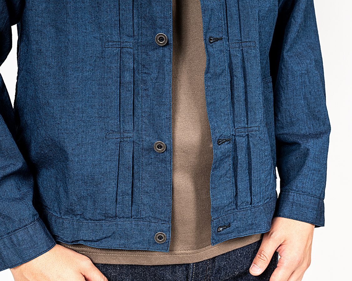 丈は63センチを狙いましたが、サンプルは縫いあがり62.5/洗いあがり61ほどの上がりでちょっとだけ短い。同じく、袖も短い。量産ではパターンを+2センチ程度して、Tシャツがぎりぎり見えるか・隠れるかのベストなバランスを狙います。