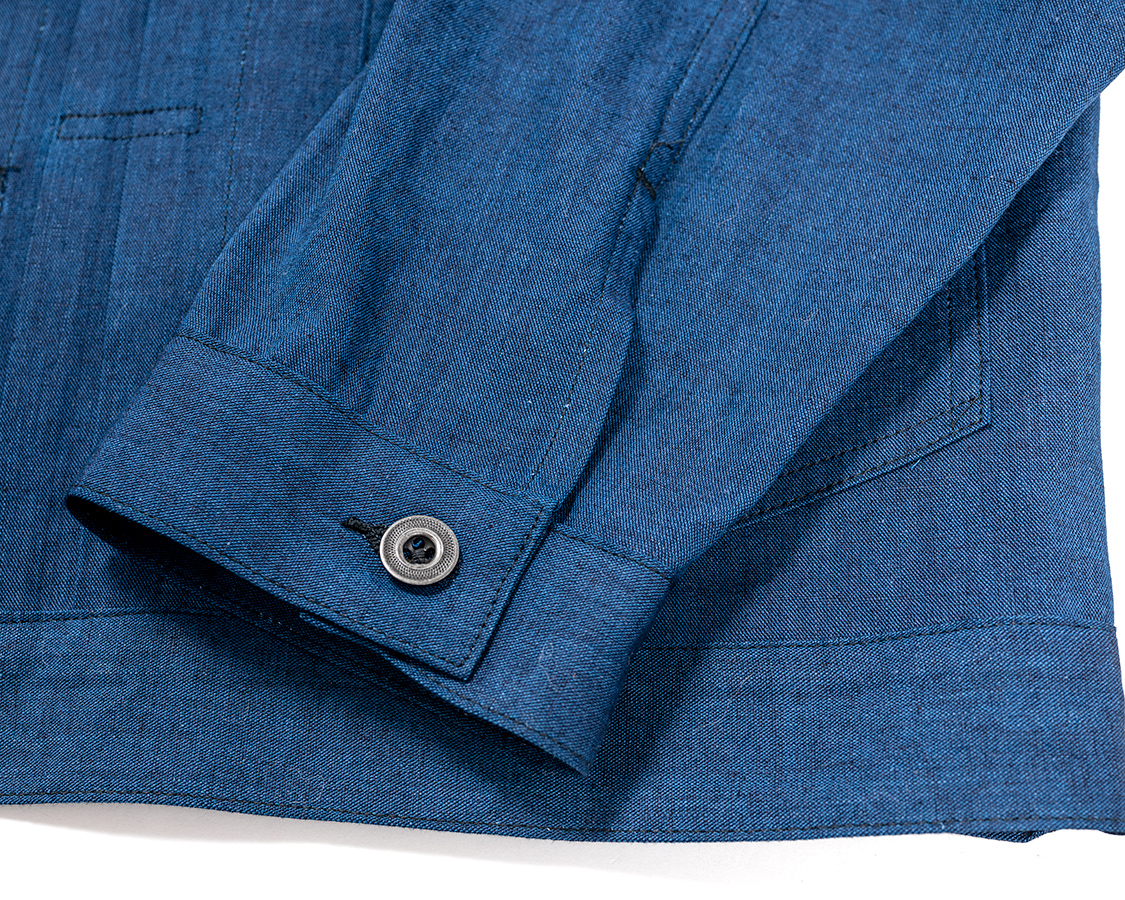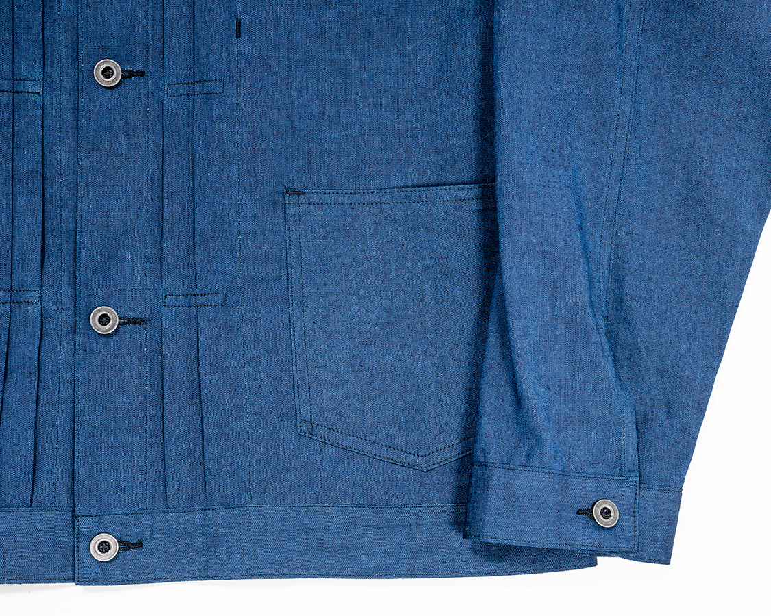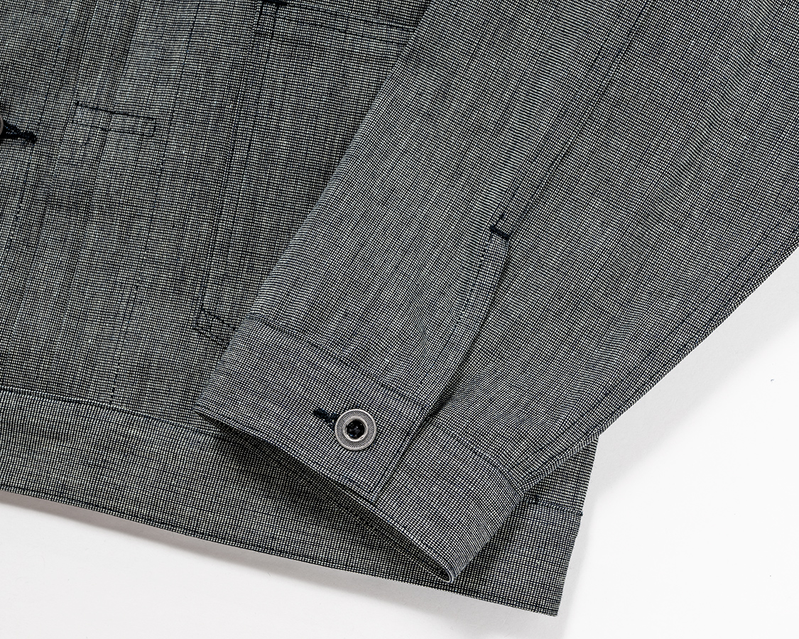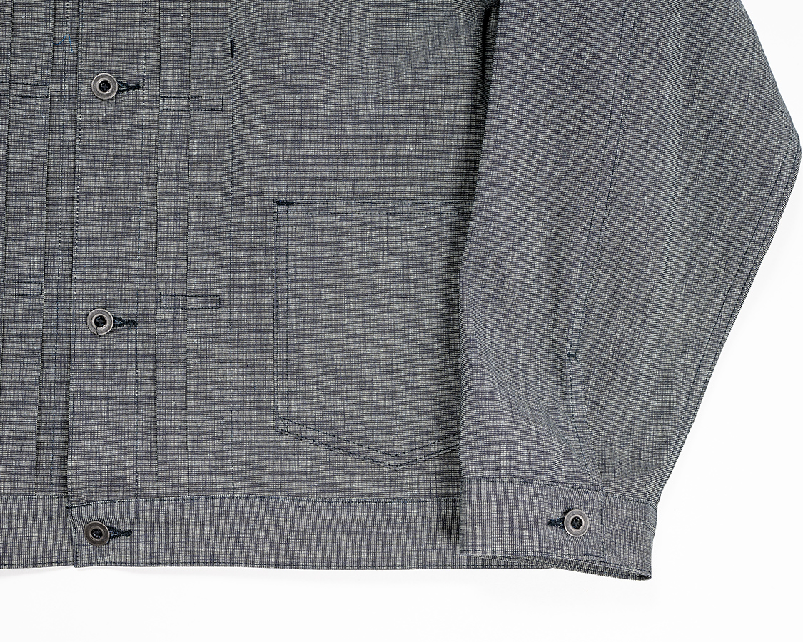 裾はまっすぐ。前下がりの無いパターン。私はカバーオールの型紙でついきつい前下がりをつけてしまいます。昔見た、ビンテージがそうだったのでつい真似してしまうのです。ただ、上背の無い日本人が着ると、どうしても、後ろ着丈に対して前が長く見える。Gジャン型のハオリが着やすいなと思ったのは、この「前下がりが無いから、前丈が長く見えない」が大きく関係しているように思います。