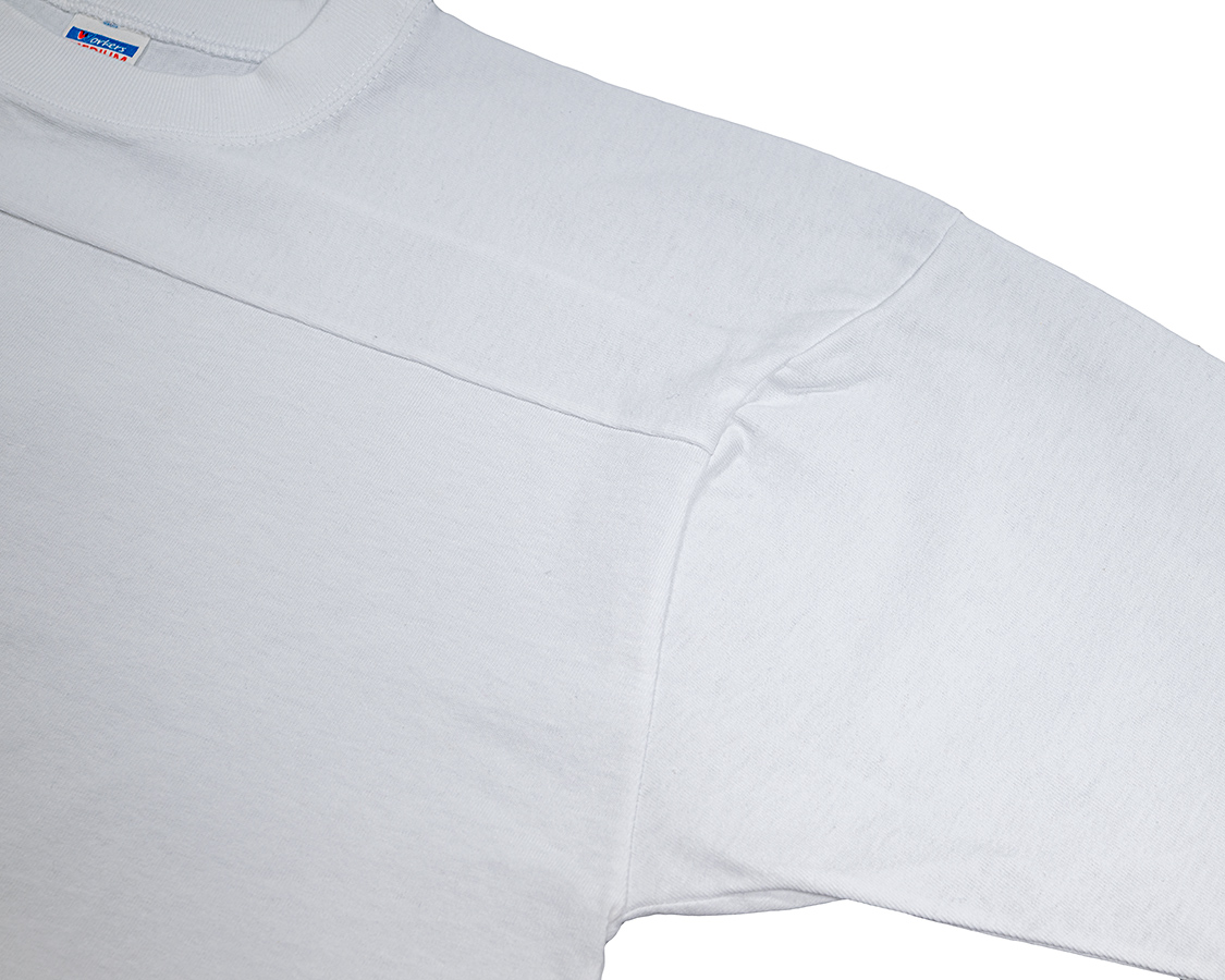 矢印部分、糸がピョコピョコ出ているのは「天地」と呼ばれる始末。ダブルステッチが入る始末と雰囲気が違う。比較的古いTシャツで見られる仕様。