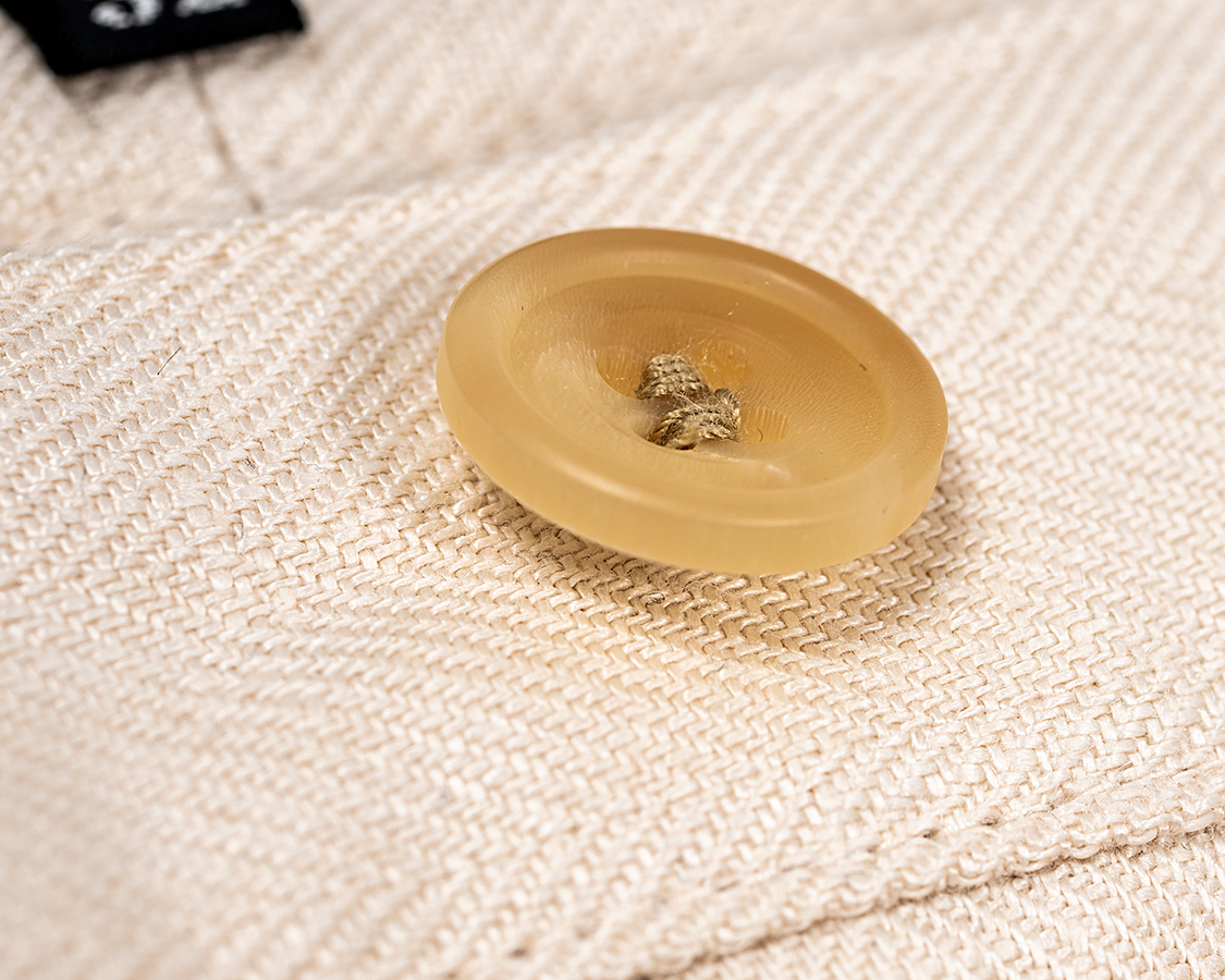 フレンチリネンには豪華に水牛ボタン。ただでさえ生地値が高いので、もうあきらめて付属も豪華に。