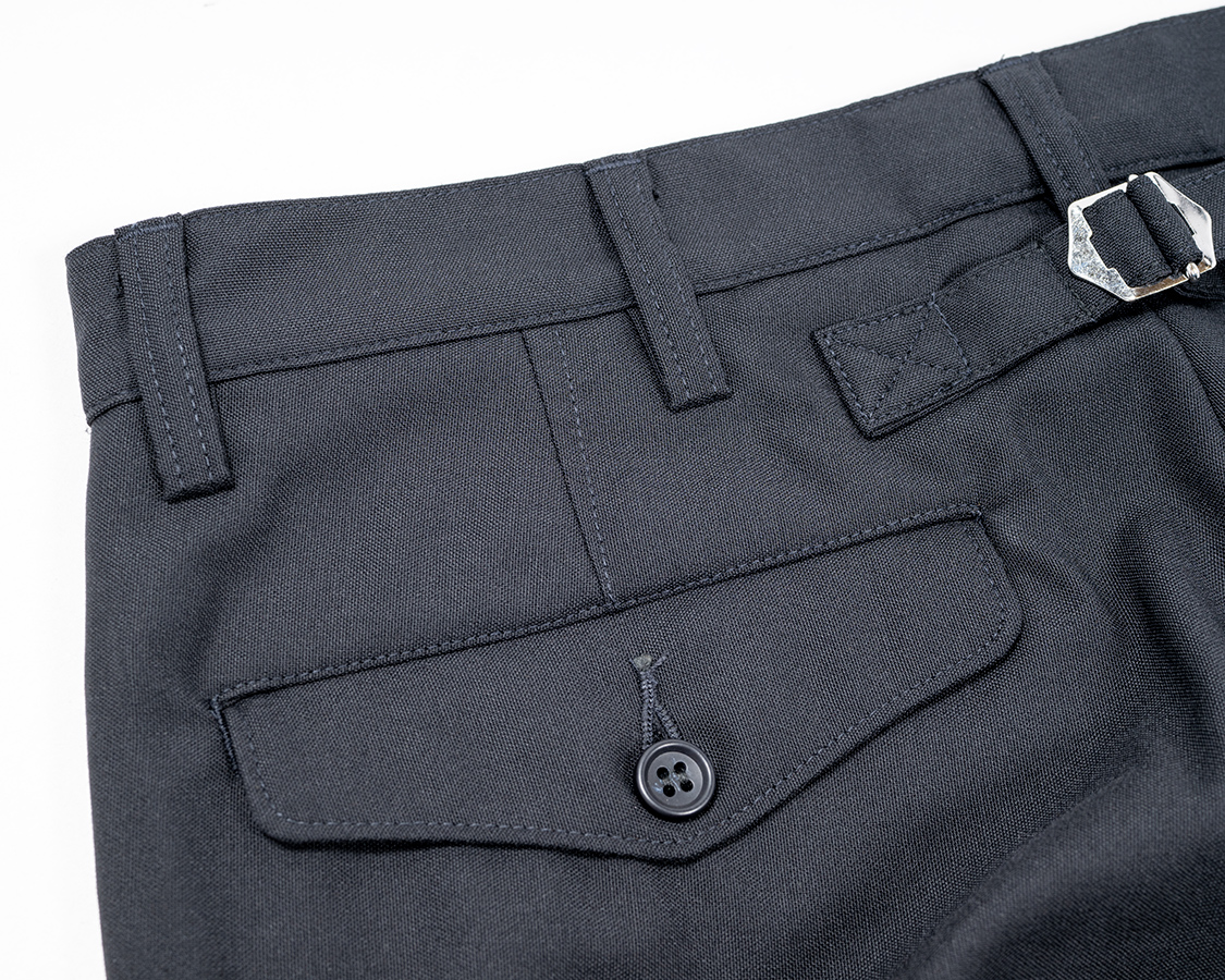 左右フラップ付きポケット。後ろ中心に尾錠。「これでもか」とアイビー的な仕様を盛り込んでいます。