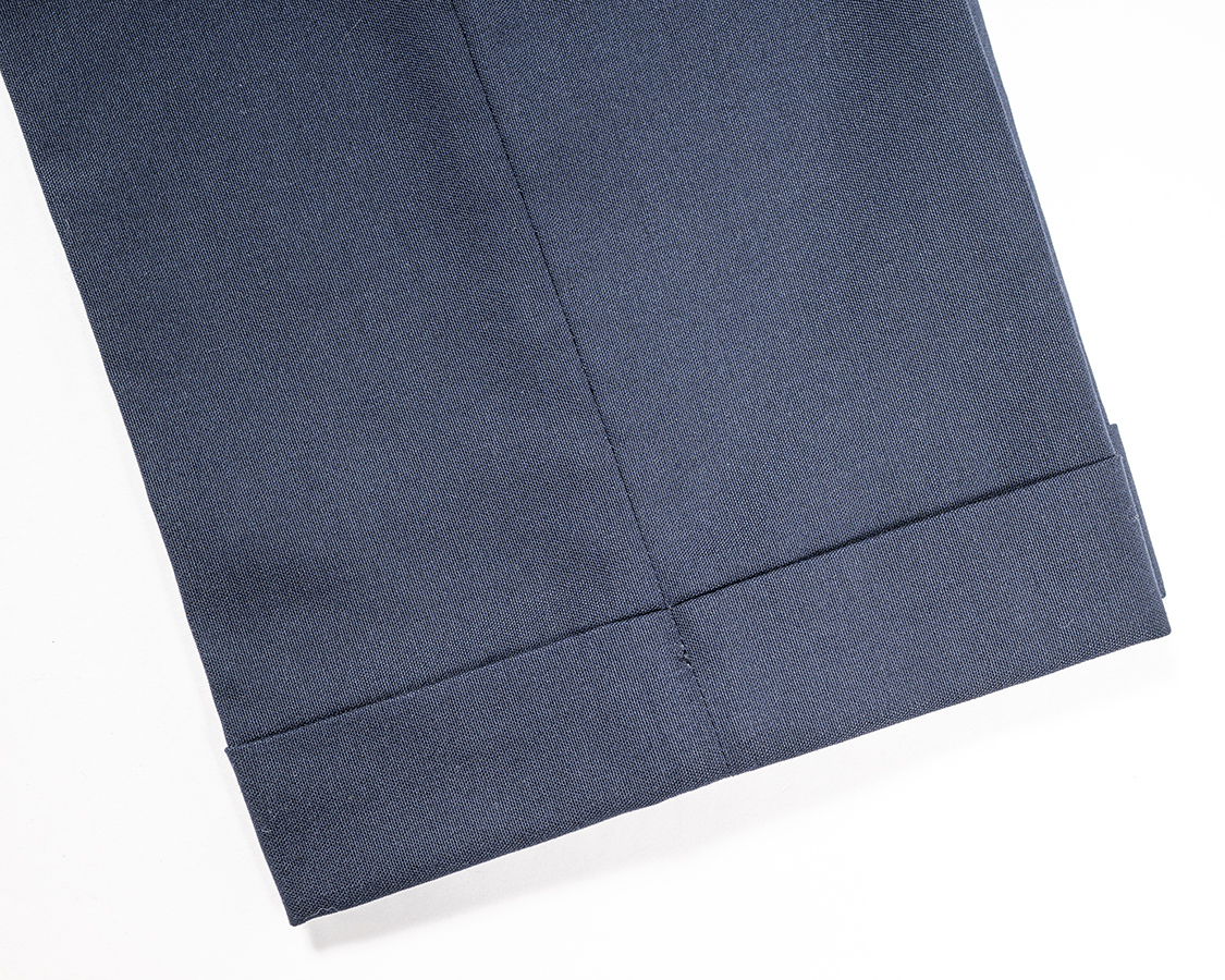 裾、サンプルはモデルに合わせてダブル始末しましたが、量産の納品時はロックのみ。レングスは縫い代込で91 センチ。ダブルの巾にもよりますが、80 センチ上がり程度にダブル始末できる長さです。それより俺は足が長い! という方は取り扱い店舗様にご相談ください。生地を用意しますので、折り目で隠れる位置でつなげば裾上げは可能です。 (お直し屋さんの工賃は通常よりかかります)