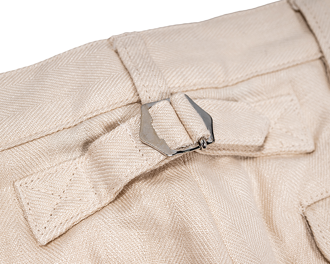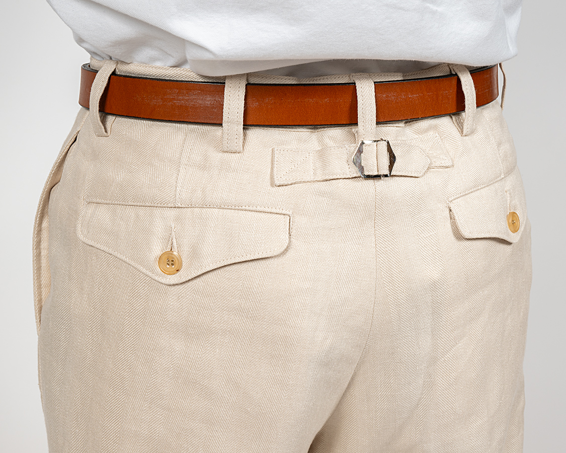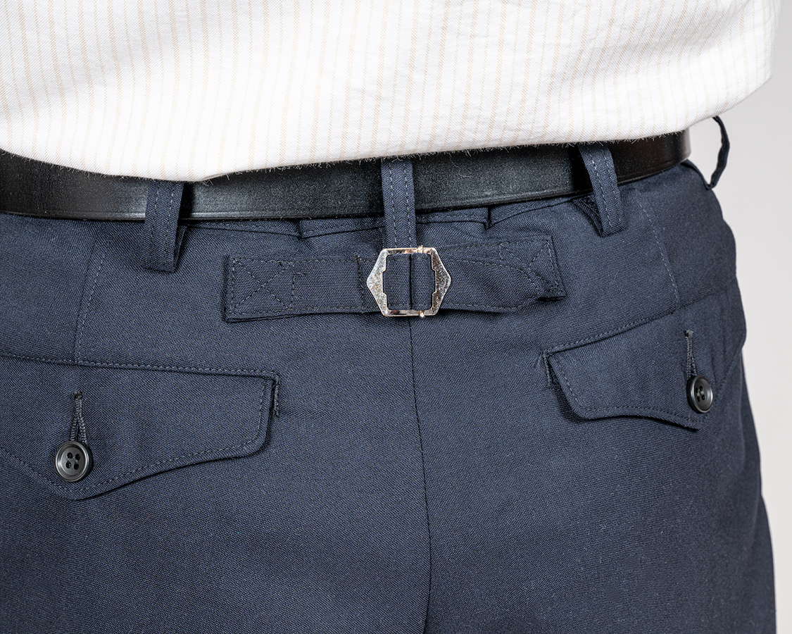 ダーツ・タックの無い軍パン(ベーカー)はウェストの調整ボタンや、極端に深いまた上を利用してゆとりを確保。