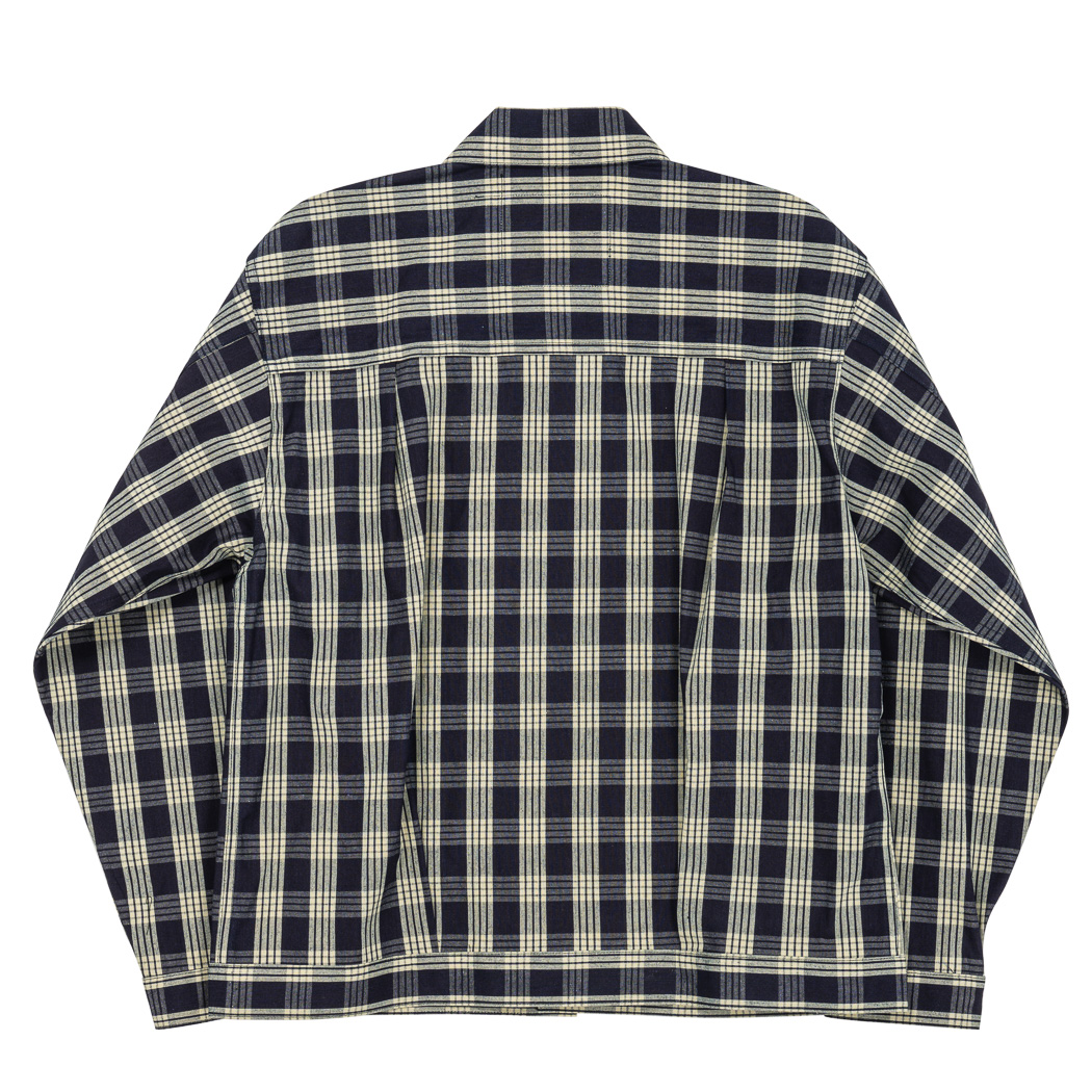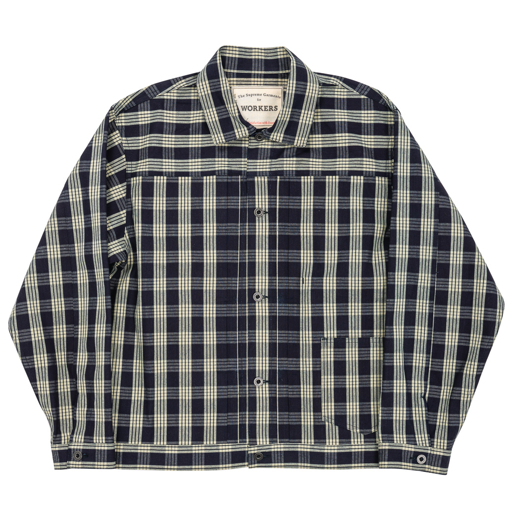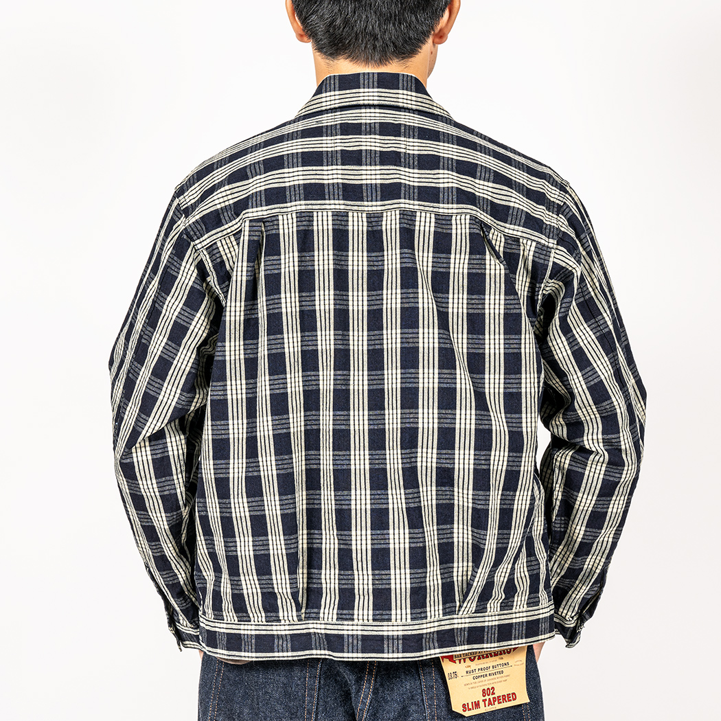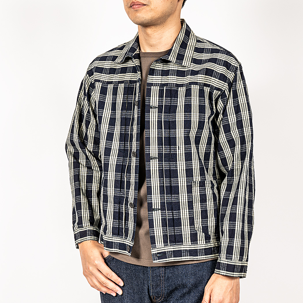 PincheckとPlaidは他のシャンブレー5オンスと比べると少し厚い7.5オンス。いわゆる「羽織もの」の厚み。インディゴ部分はこちらもロープ染色。