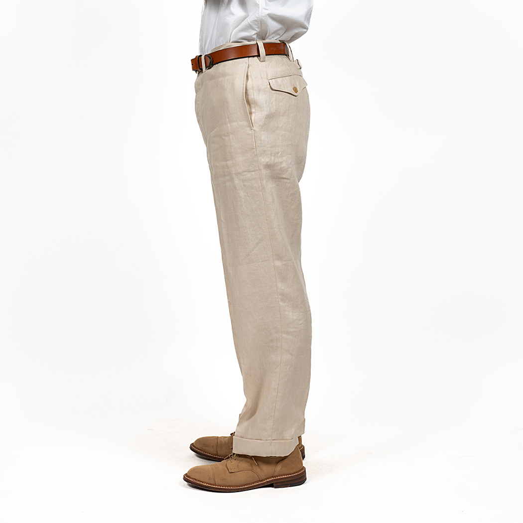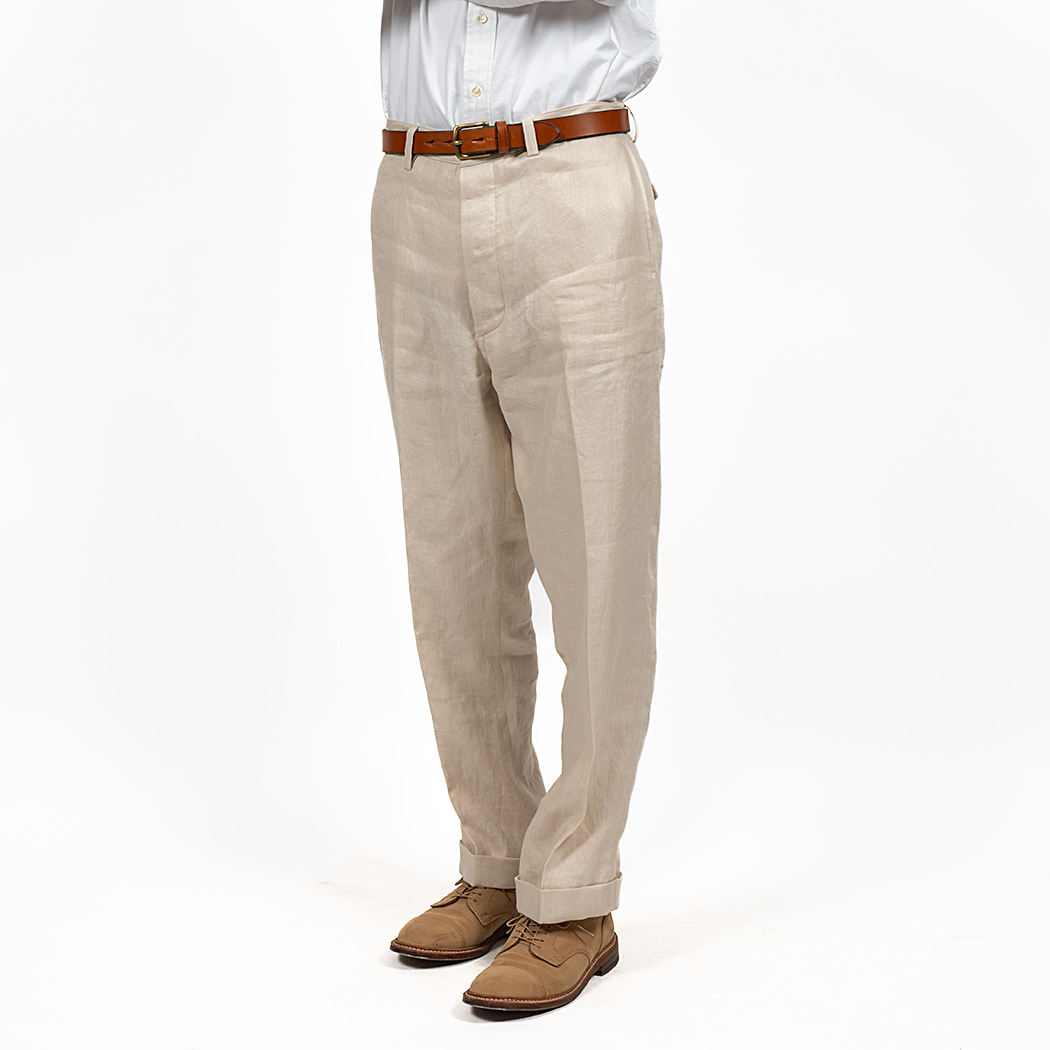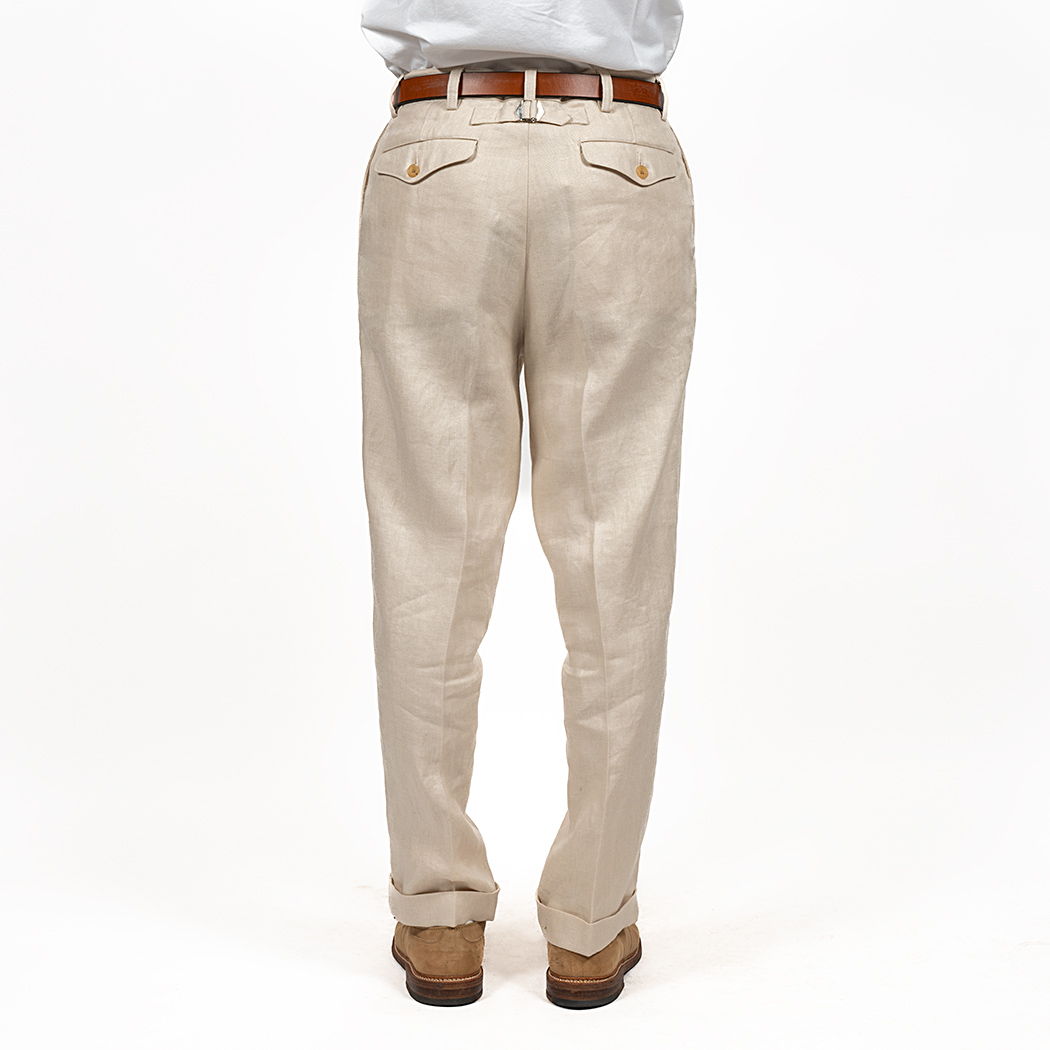 プレインフロント(前にタック無)、サイドの縫い目利用ポケット。バックシンチにフラップ付き玉縁ポケット。これでもかと「アイビー」らしい仕様を盛り込みました。