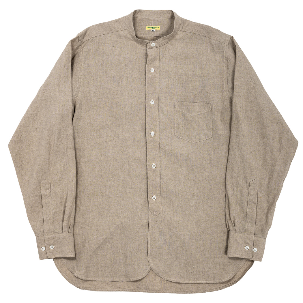 形はおそらくイギリスミリタリー物と思われるバンドカラーシャツから着想を得ました。着丈はオリジナルが80センチを超えるところ、WORKERSは76センチ程に変更。裾を出しても、入れても着られる、WORKERSが考える「Modified」な着丈。