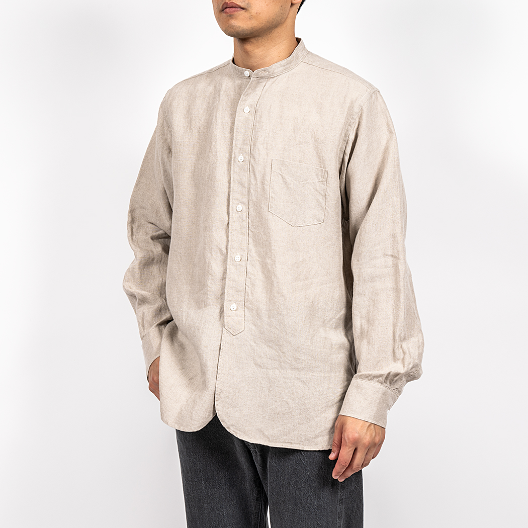バンドカラー、最初はちょっと変わった襟型に見られましたが、昨今のあまりに暑い(いや熱いに近い)日本の気候によく合っています。襟はちょっとほしい。でも、台襟+羽襟は暑苦しい。そんな時にバンドカラーシャツが最適です。