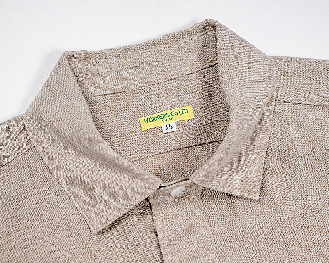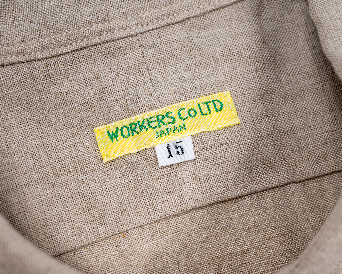 高倉健さんが買い物に着てくそうなタグ。シャツ自体、元ネタはイギリス軍もののようですが、襟がつくとヨーロッパ古着のグランパシャツのようでもあり。で、フランス的な雰囲気のネームをつけてみました。似合うと思うのです。