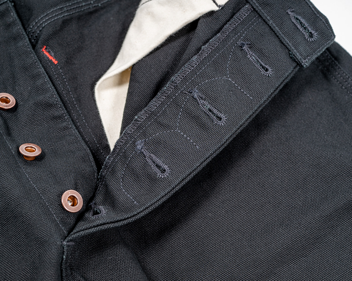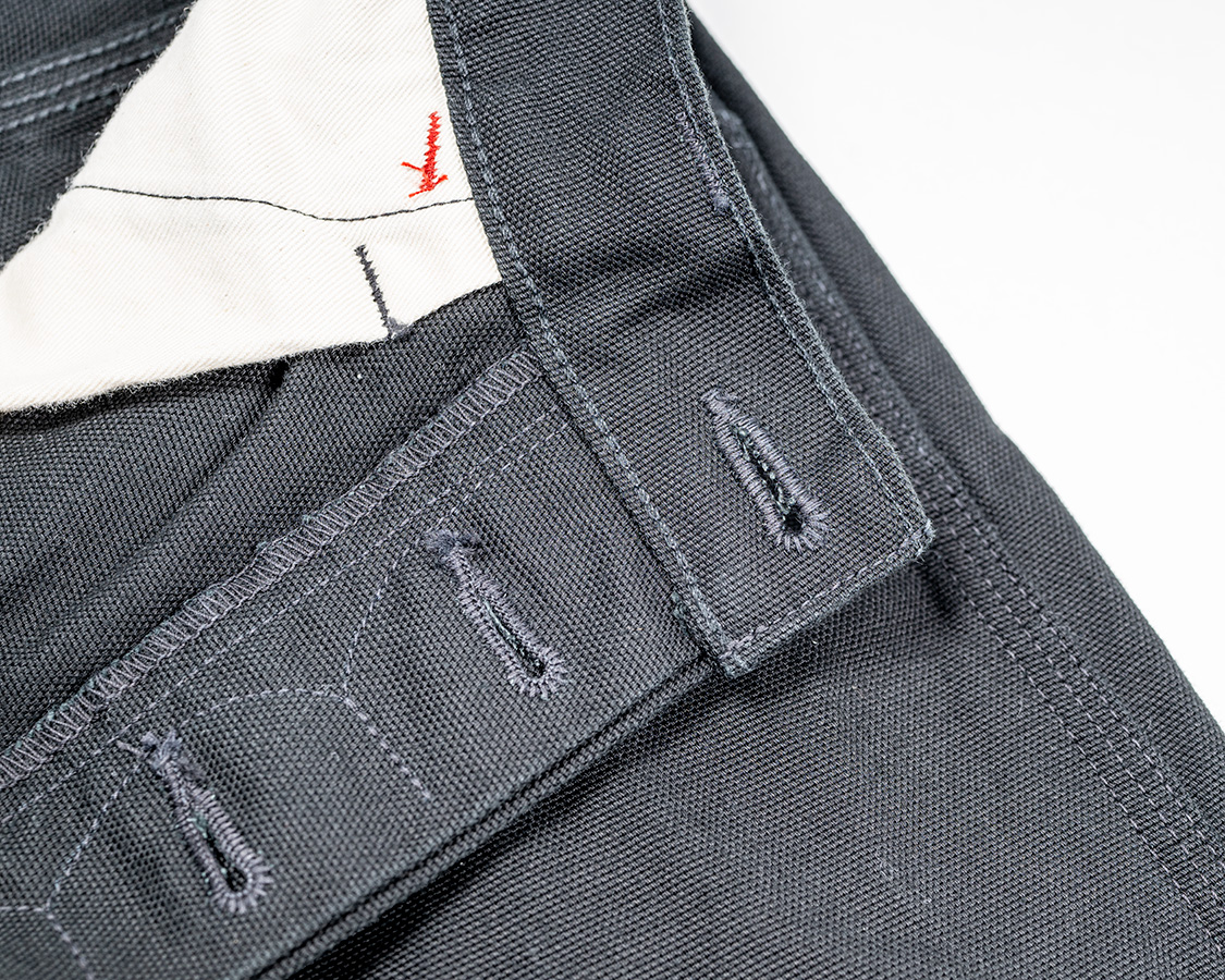 フロントボタンフライ。ヒヨクを見返しに止めるぐにゃぐにゃステッチあり。ここはヘラクレスの古着を見て真似したところ。