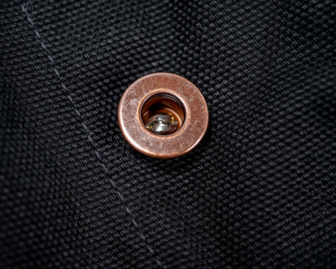 ブラックダックは表面は均一。これが着こんでこすれてくると徐々に表情が出てきます。実は、最初ブラックツイルも良いかな?と思い、同じぐらいの厚さの綾織生地(ツイル)で作っても見たのですが・・・うーん、やはりワークパンツはダックだなと思いなおし、結局ダックで作り直しました。