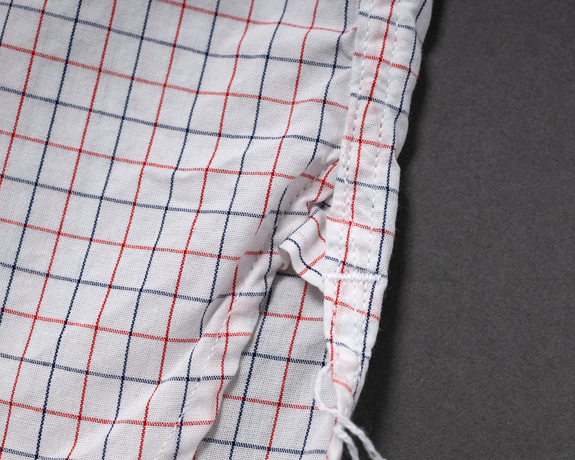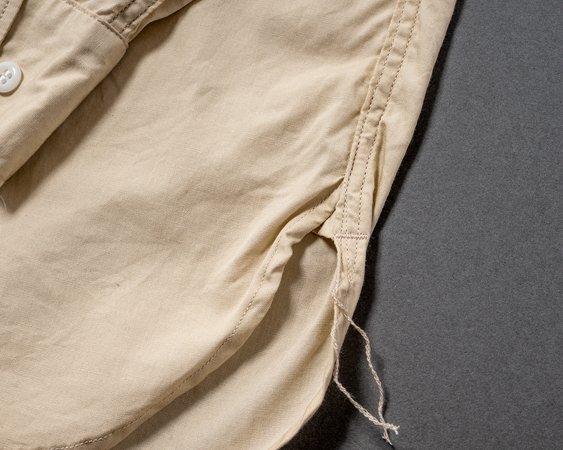 脇はマチ+ほつれ止め閂始末。いわゆるふる~いシャツの仕様。先に裾を始末してから脇を縫う。2010年ごろ、皆、やっきになってこの仕様をやってました。あの人たちはどこへ行ったのか?今でもちゃんとやってるのはEGぐらいです。やっぱり、一本筋が通っているブランドは時代に合わせるだけでなく、やることはやるのです。