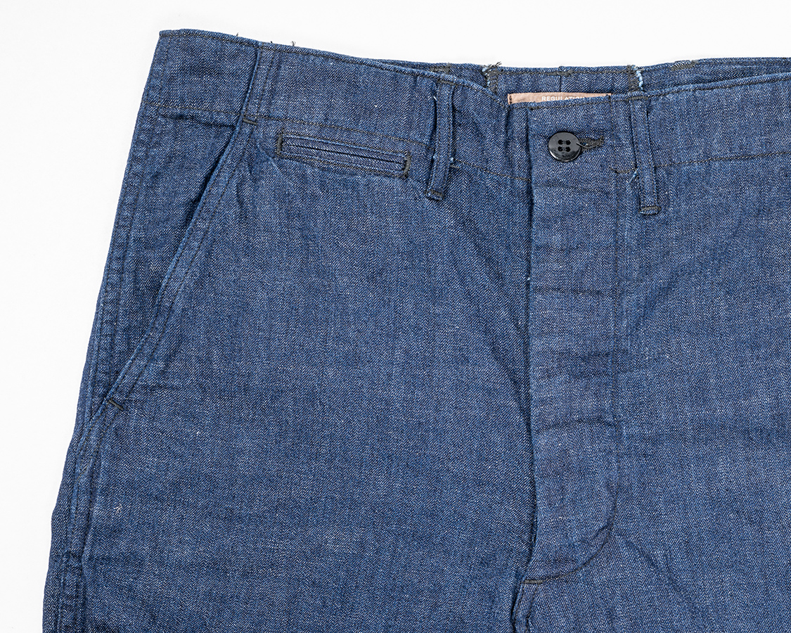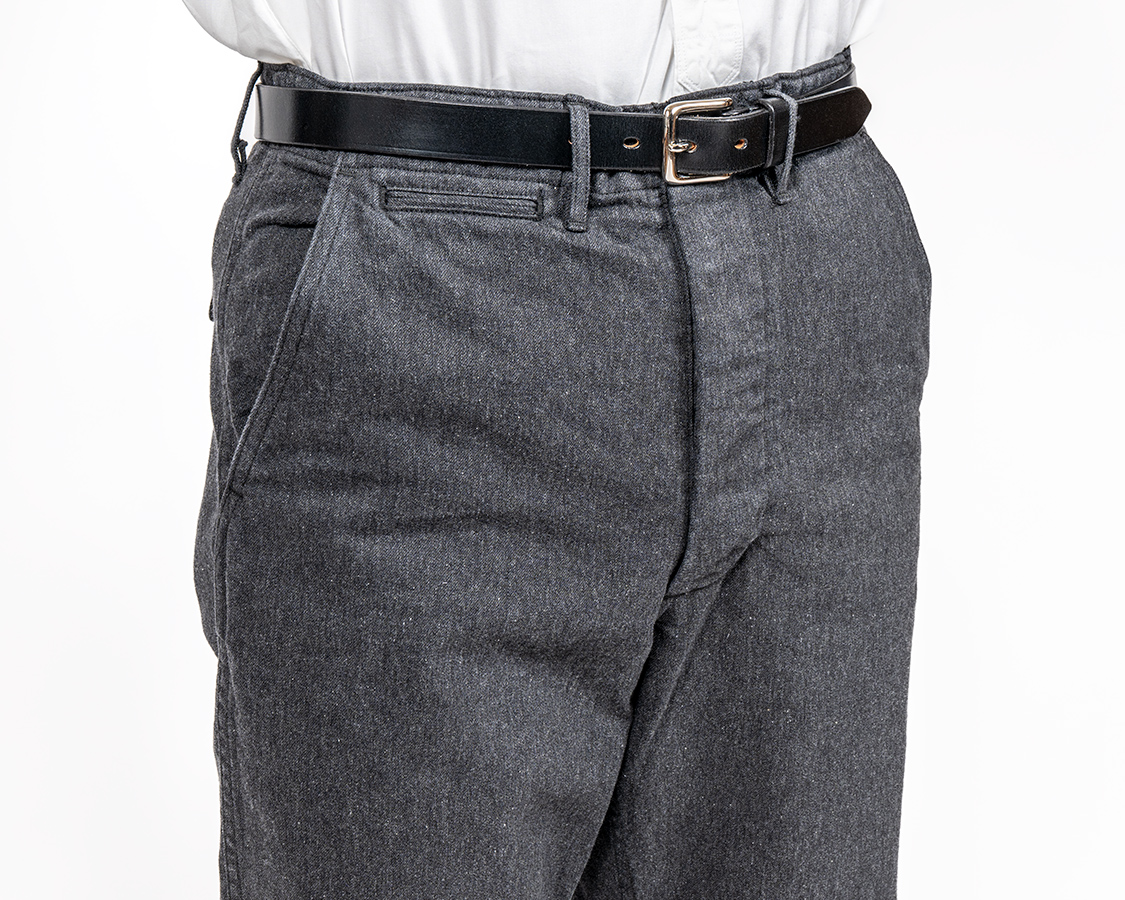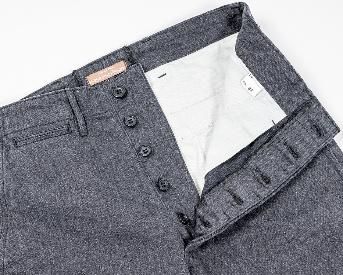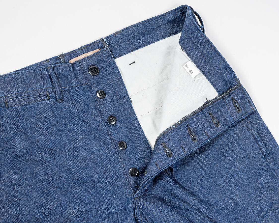 フロントボタンフライ。WORKERS伝統の「いい加減ファスナーにしたら?」と言われる部分ですがこだわりです。ファスナーと違って、ボタンが取れても直しやすいというのもあります。