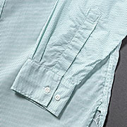 型紙ベースは最近作っているBand Collar Shirt。フロント裾がラウンドして、クラシックな雰囲気。丈は76-7 センチほ どで長すぎない。出しても入れても着られる丈。襟が今期はRound Collar。台襟は低く、バンドカラーと同じものでそ こに丸襟を取り付けました。この「台襟低め」がポイント。夏に着られるシャツなので、あまり首回りが覆い隠されると暑い。だから、台襟が低め。個人的にも、あまりに台襟が高くて、 前のボタンが二個あったり、羽襟が長い「デザイン過多」なシャツは好みでない。かといって、一時期流行ったやたらと小さい羽襟も今は違う。こういう、自分自身の微妙な好みや、感じる時代性。それらを最終的に「寸法」「パターン」に 落とし込んで製品を企画しています。