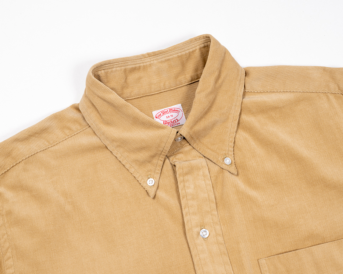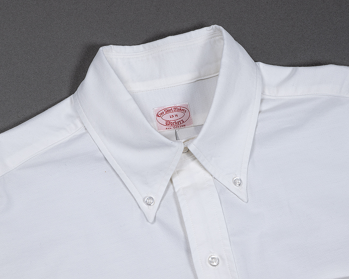 Modified BDと比べてみてください。ここが開いている分、台襟のボタンを開けると中に着たTシャツの首元がよく見えます。本来、台襟のボタンを閉めて着るシャツが、古着になって日本に入ってくる。ネクタイを閉めないで着る。結果、首元が見えて、中に着るTシャツまでコーディネートの対象になる・・・という、進化というか、変化というか。服が、本来作られた目的から外れて、徐々に着方が変化していく、面白いところです。(海外のアイビーリーガーもネクタイなしでTシャツの首元を見せたりはしていそうですが。映画「セントオブウーマン」あたりをみてみてください)