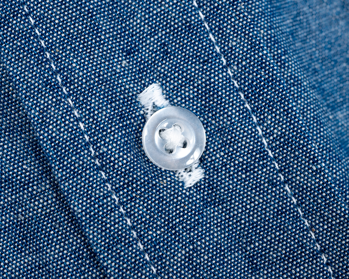 超どうでもよいのに、つい再現したくなる。裾の三巻の端、手勝手でいうと縫いの最後の部分。ここで金具を抜いて「ぐい!」っと太く縫う。これが、古着のシャツでよくやっているので再現してもらいました。