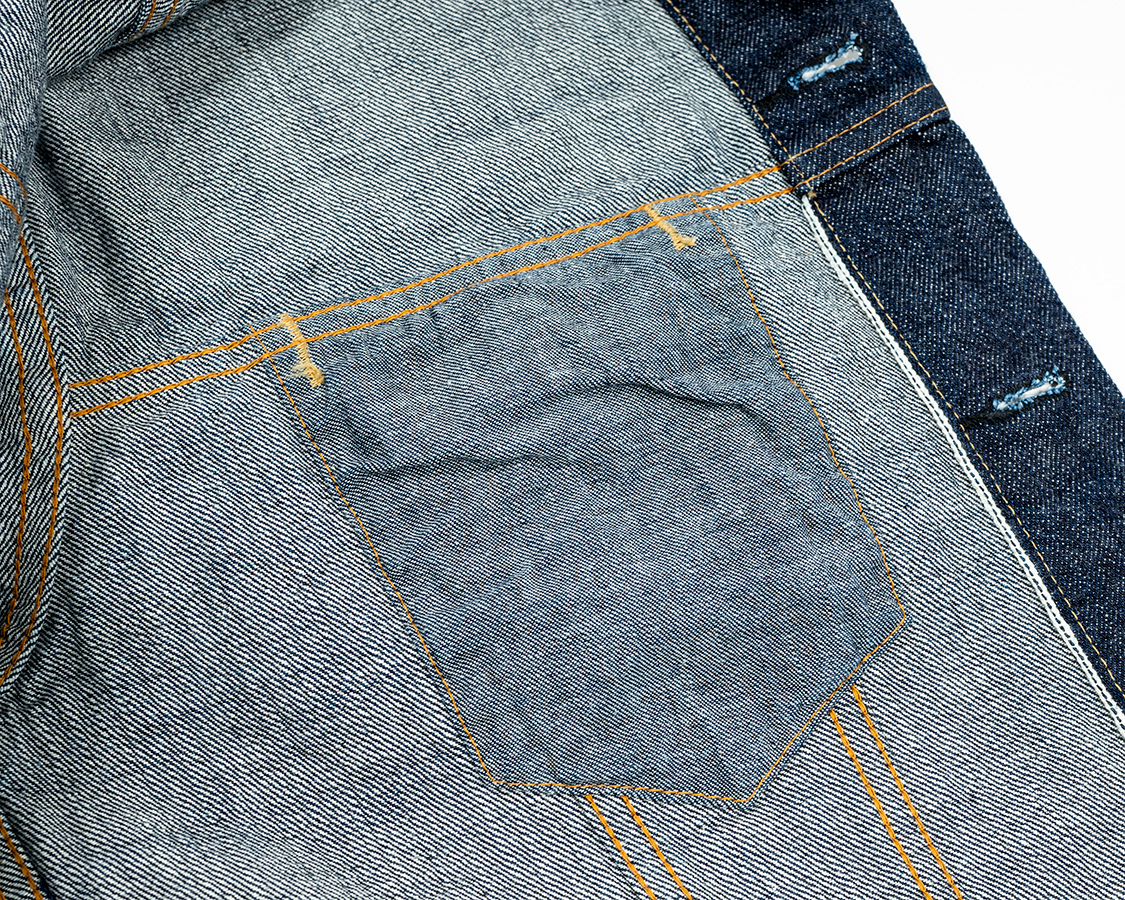 裏の貼り付けポケットも薄いデニム。右にちらっと耳が見えます。サードは本来、セルビッジ無ですが、今回はせっかく、シングル幅・セルビッジありの生機なので耳を付けました。