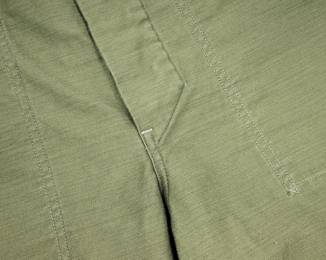 比翼のホールの合間はバタバタしないように止めています。これが表には貫通せず、「見返し」と呼ばれる部品にだけ取り付けられています。クラシックなトラウザーズではよくある仕様ですが、当然手間がかかる。リーバイスははるか昔はこのステッチに近いものが貫通で入っていたりしましたが、途中からやめてしまいます。ワークパンツには長々、このステッチは残ります。ここが、ジーンズと、そのほかのパンツの分岐点だと私は勝手に思っています。