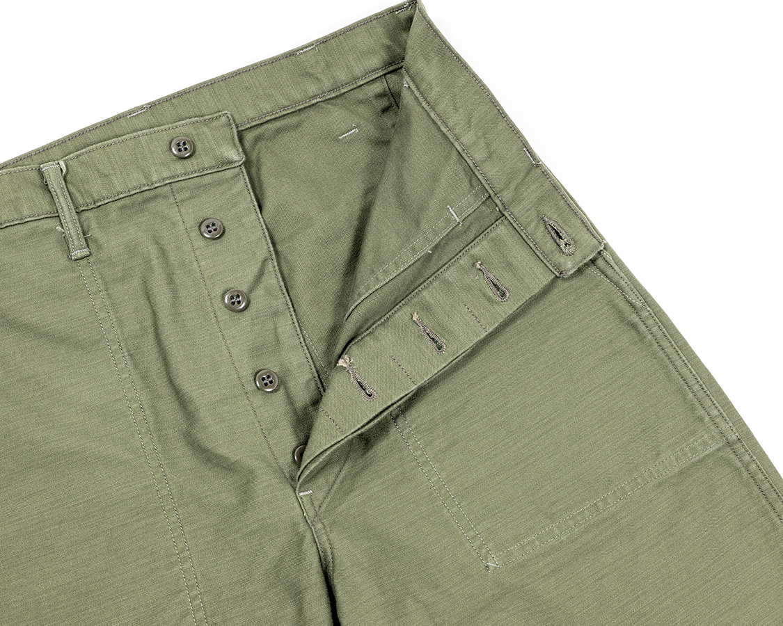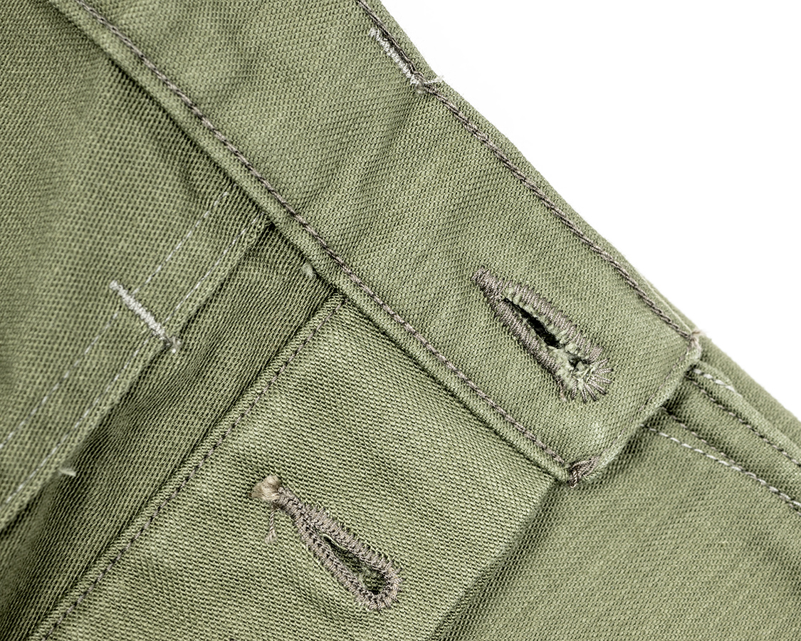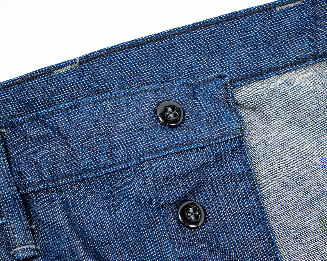フロントはボタンフライ。比翼(ボタンホールの開いているパーツ)の端がロックではなく折り込んでいるのが特徴。