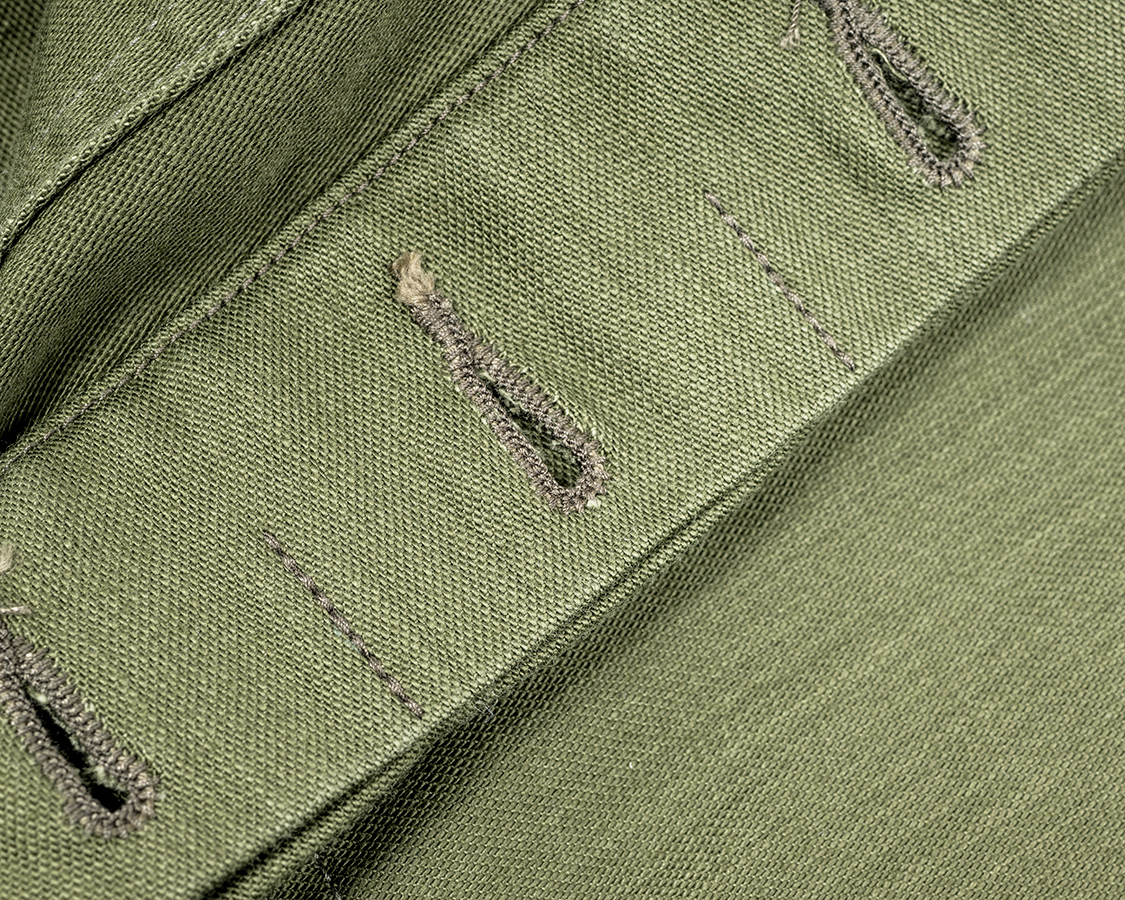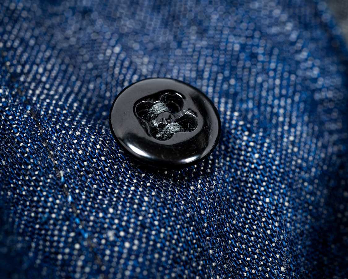 ボタンは少し丸みのあるもの。よくミリタリーで見るあの形。つけるときは、ミシンの往復回数を増やしてもらい、かつ、ボタン付けミシンも「上糸・下糸」のある、外れにくいものをつかってもらっています。ただ、下糸はボビンという小さい軸に巻くので、時々糸を交換しないといけない。これが手間なので、現代では、下糸が無い「単環」と呼ばれるミシンでボタン付けされることが多いです。あの、ちょろっと出ている糸を引っ張るとびーーーーーっと抜ける。あれが単環です。