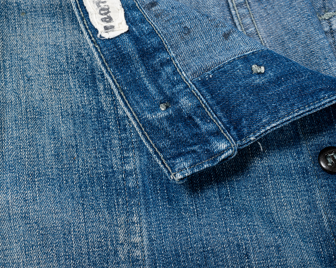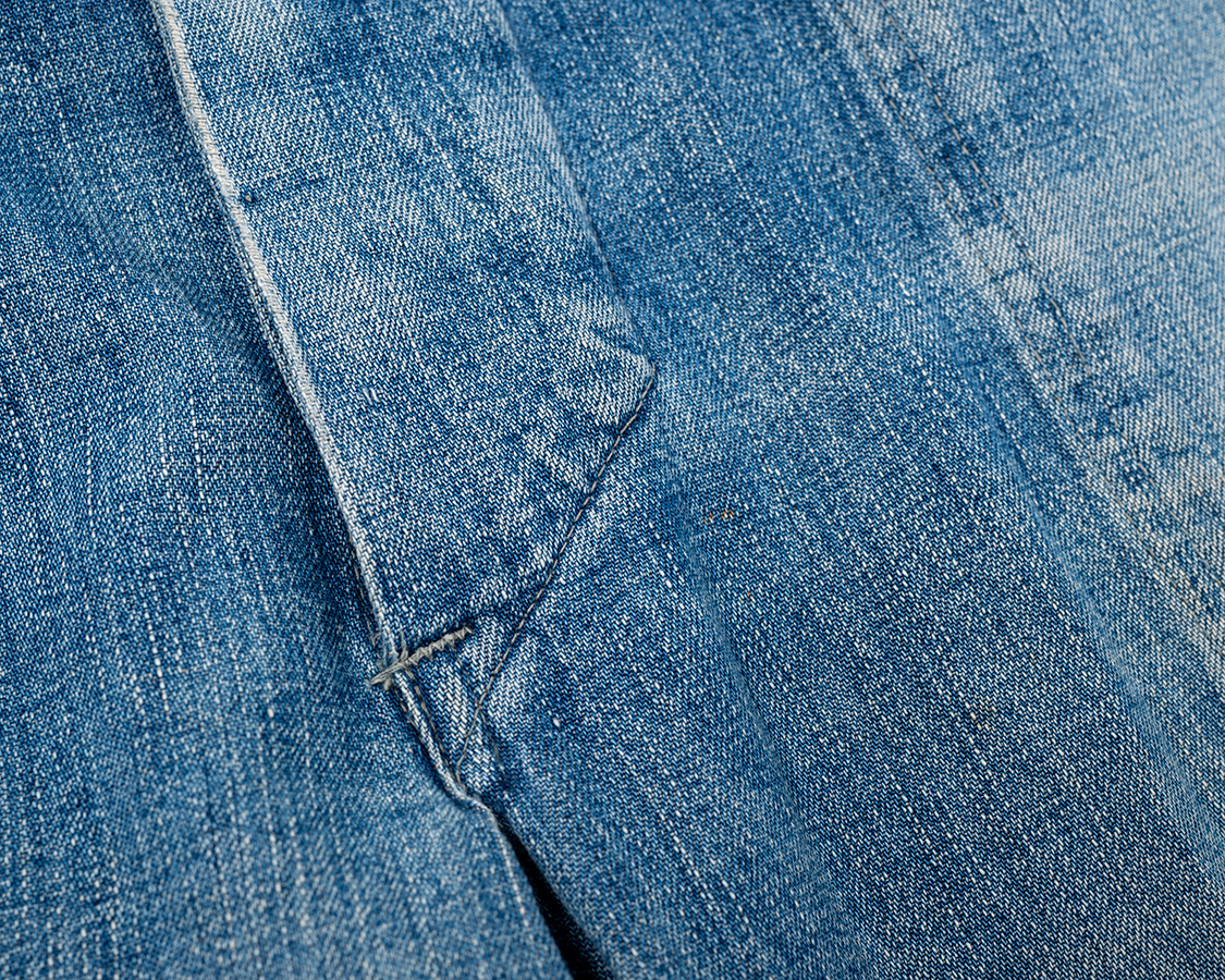 ダーツの地縫いが外れかかって、中の色落ちしていない部分がちらっと見えています。ポケットのカンヌキ、妙にポケットの口幅より広い。