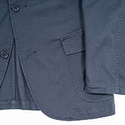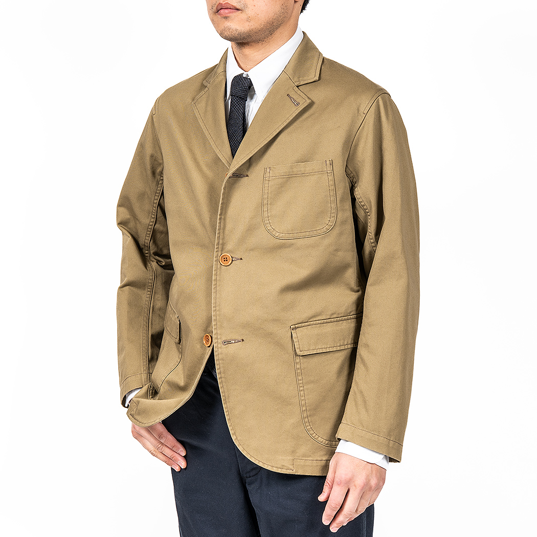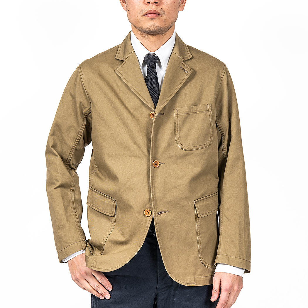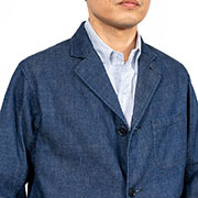 チノ2 色とデニムはOfficer Trousers とセットアップ、8 オンス。袖裏は無し。ざっくり着られる、洗ってパッカリングも出てカバーオールのようにラフに着られるジャケット。厚すぎない・重すぎないので秋口から気楽に着られます。10 オンスのがっしりした感じも良いのですが、なじ むまでが結構大変。そこで、今期は8 オンスを選びました。