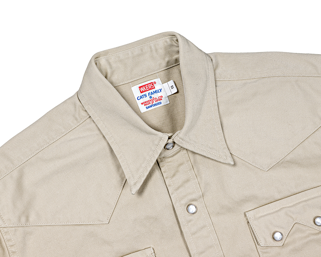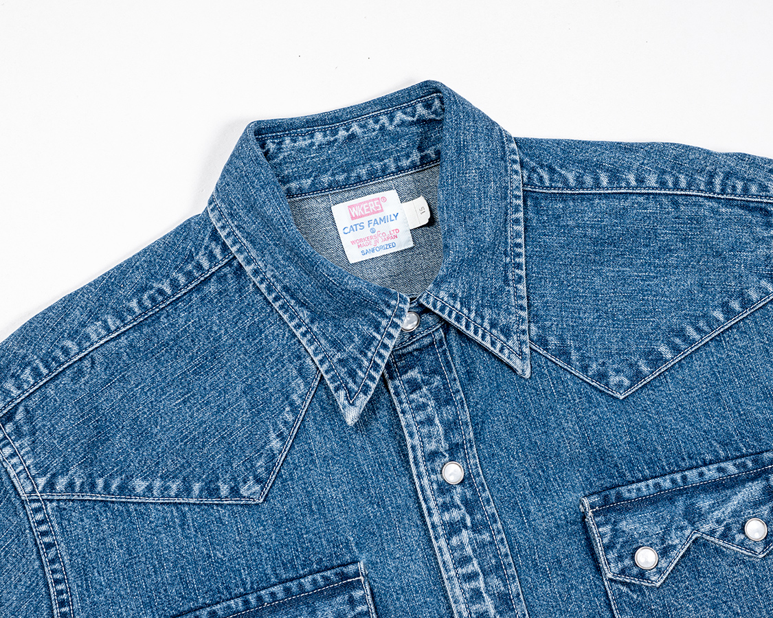 ロングポイント(襟がちょっと長め)がウェスタンシャツの特徴。やりすぎると着づらくなるので「ウェスタンらしさ」を感じるギリギリぐらいに。