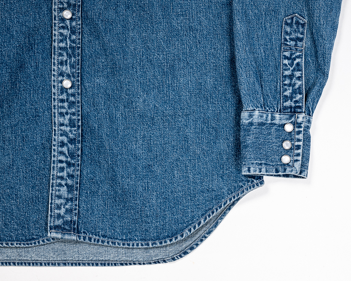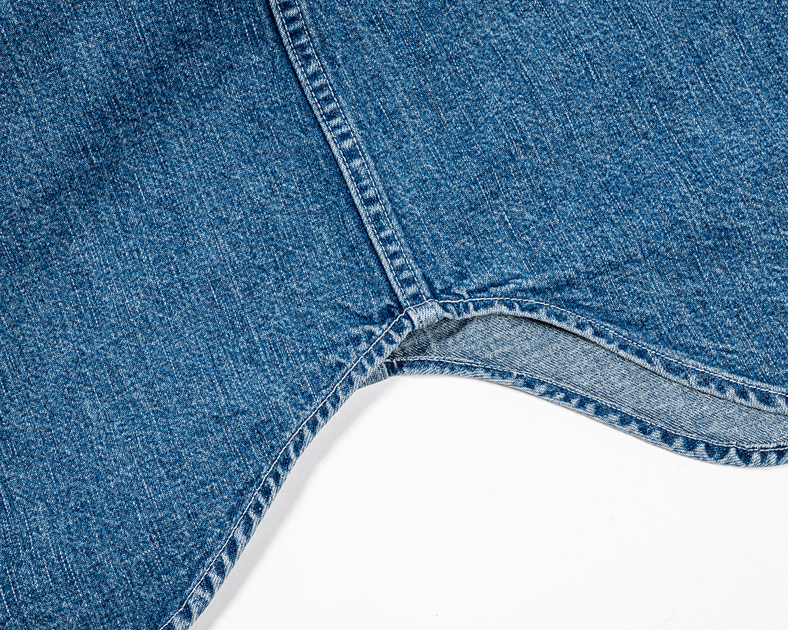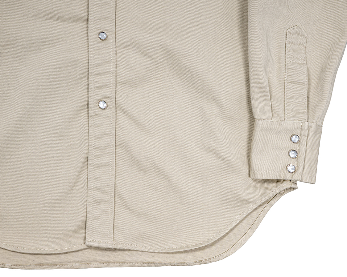 フロントから脇に向かっての切りあがり。ここのライン、シャツを作るときに非常に気になります。オリジナルは大体、着丈が長く、ここの切りあがりがぎゅ~っと激しい。ただ、それをそのままやると、日本人がタックアウトするにはきつい。着丈を短くすると、せっかくのラインが出づらくなる。