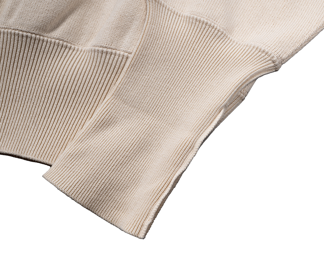リブは「総針」と呼ばれるもの。サドルショルダーの針抜きと比べると、違いが良くわかります。ここだけは、カットソーの丸編み機ではなく、セーターを作る横編み機で編んでいます。理由は、一部、編み出し部分(ほつれていかない編み止まっている部分)が必要なため。