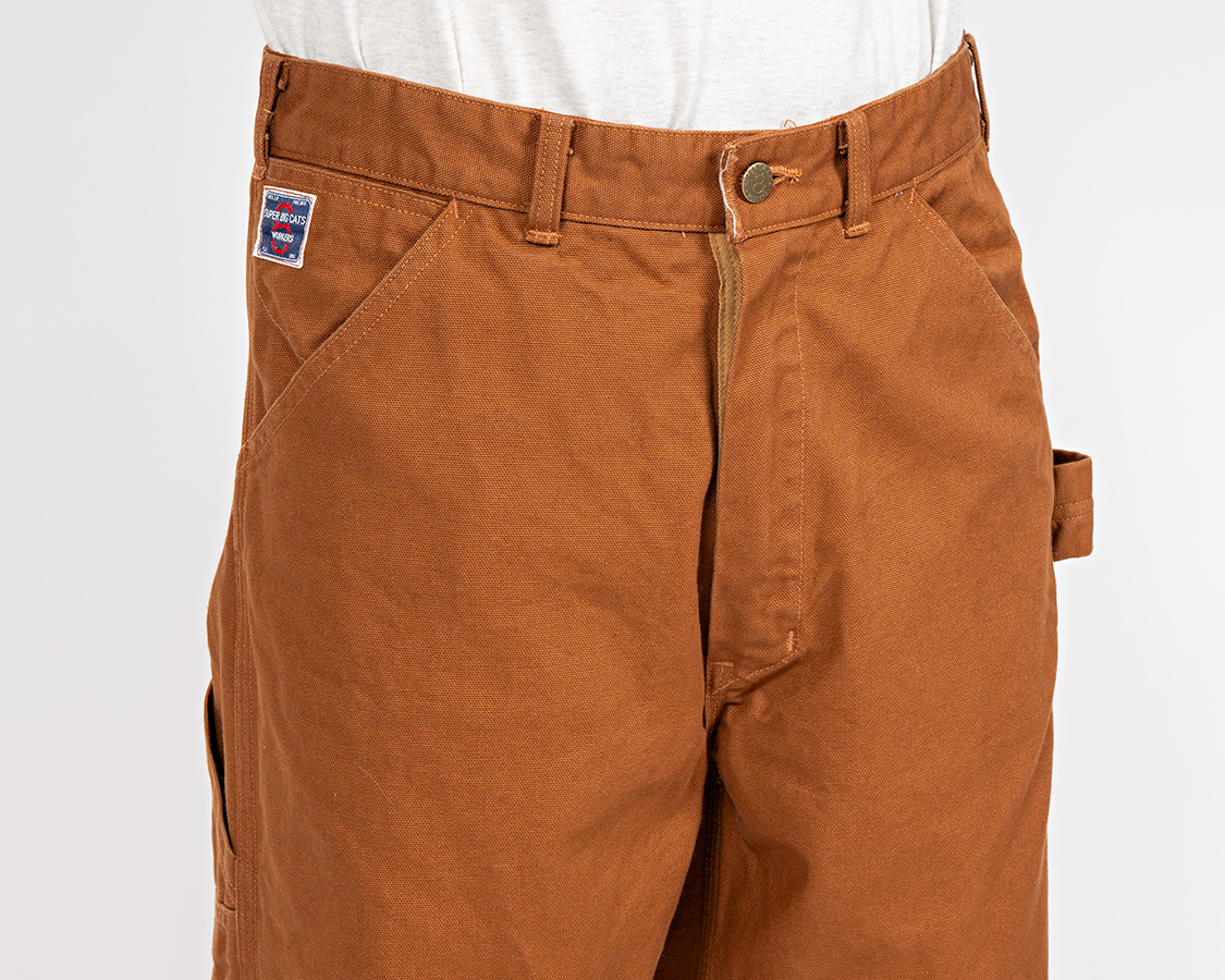 直線的なフロントポケット。コインポケットについたネーム。切りっぱなしの帯。
