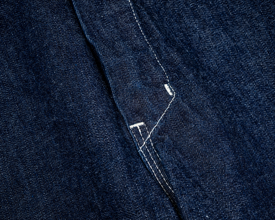 いつも、ジーンズのループを通称「バンザイつけ」という仮止めをします。はるか昔、今のようにオートベルターという、ループを切って・折って・カンドメでつけるミシンが無かったから「バンザイつけ」で仮止めをしたけです。